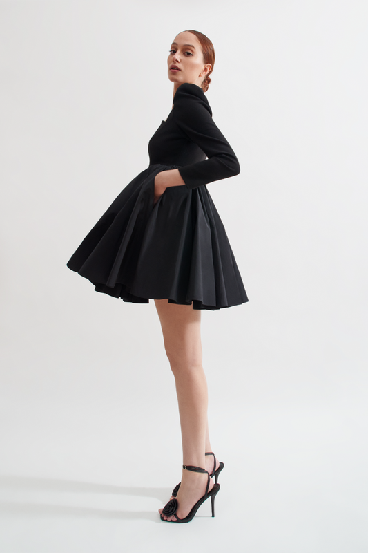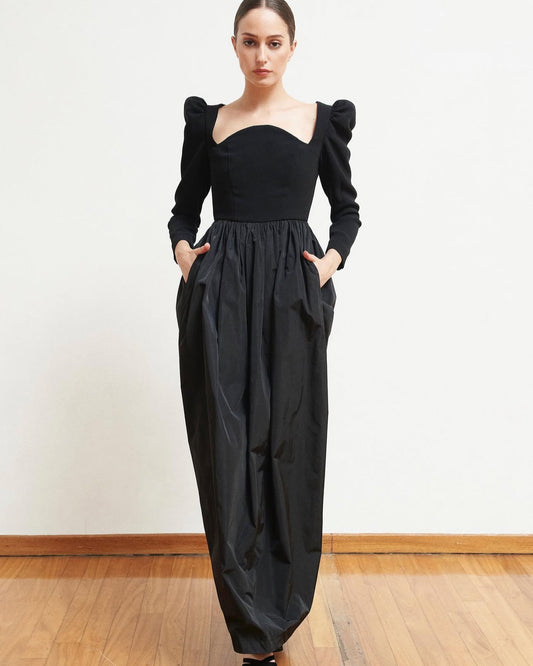 Cada prenda de Boüret es el resultado de un proceso artesanal minucioso, confeccionada con tejidos nobles como el crepé, el satén o el panamá de algodón, en una paleta de colores profundamente invernal: burdeos, verde oliva, azul noche, marrón moca y negro clásico. Siluetas fluidas, pliegues arquitectónicos y cortes que estilizan el cuerpo se combinan con detalles atemporales: mangas abullonadas, drapeados y espaldas descubiertas que equilibran feminidad y carácter.