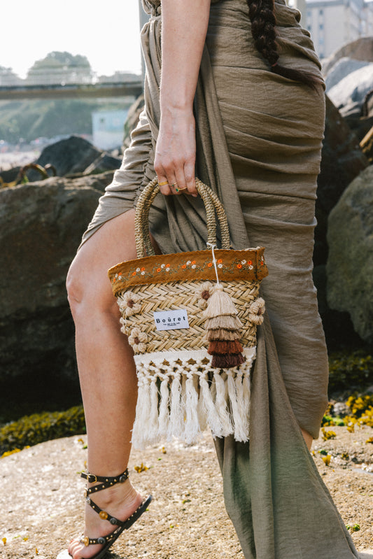 Los capazos de Boüret no son solo accesorios: son una declaración de intenciones. Hechos a mano en fibras naturales, con acabados cuidados y formas escultóricas, completan el look de invitada con un equilibrio perfecto entre autenticidad y estilo.