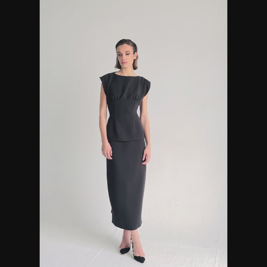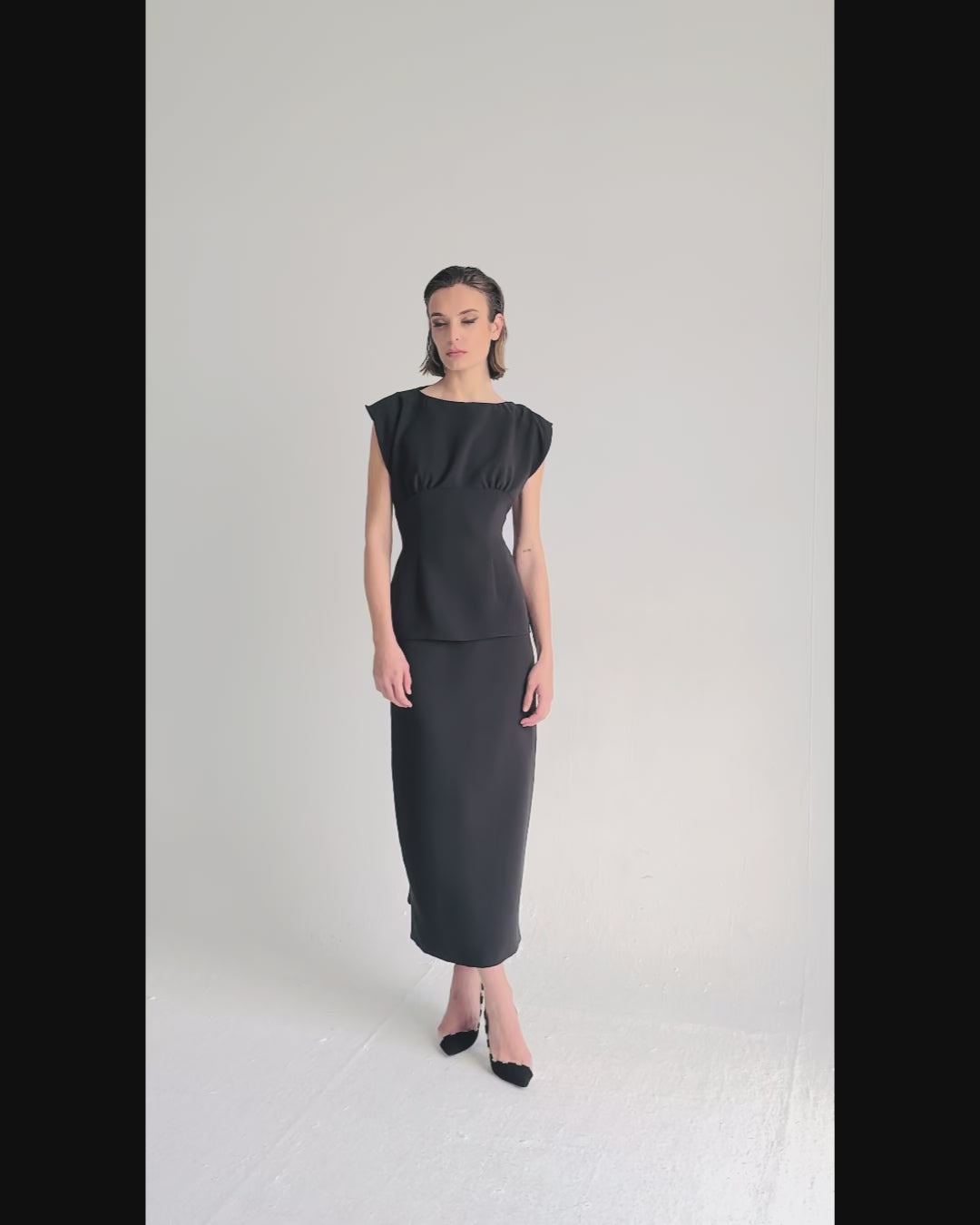 Loris two-piece set with black crepe top and skirt. Top with knot and train