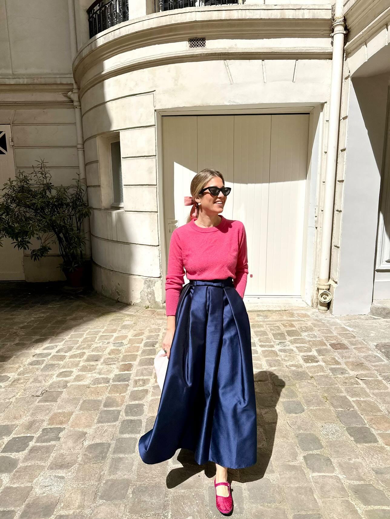 Boüret navy silk tussord skirt, designed to make an unforgettable entrance. With generous volume and ethereal movement, it features hidden pockets and a delicate removable bow that adds a charming, flirty touch.