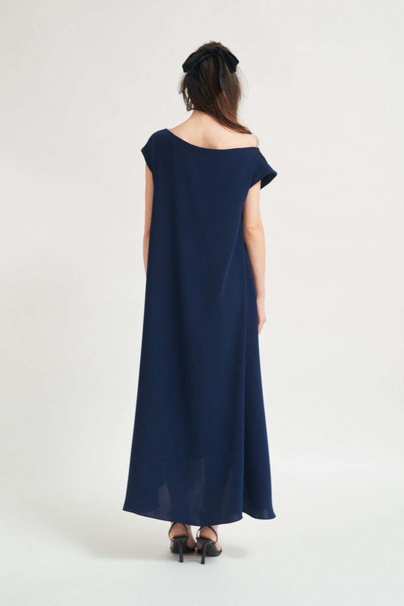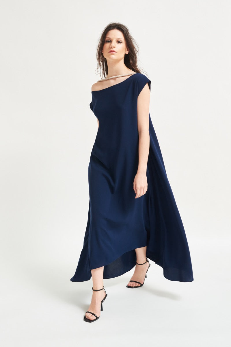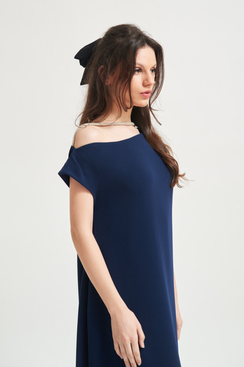 Cape dress in navy blue crepe with rhinestone cord on the neckline, with pockets.