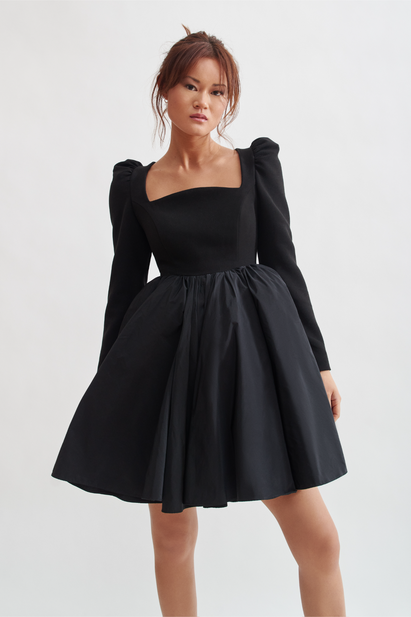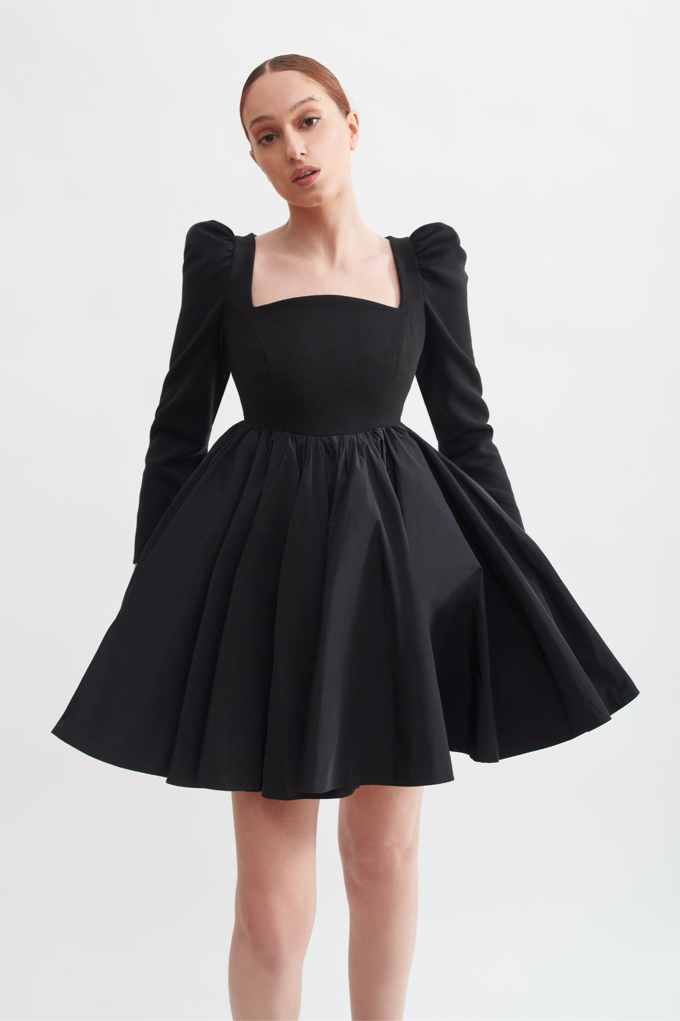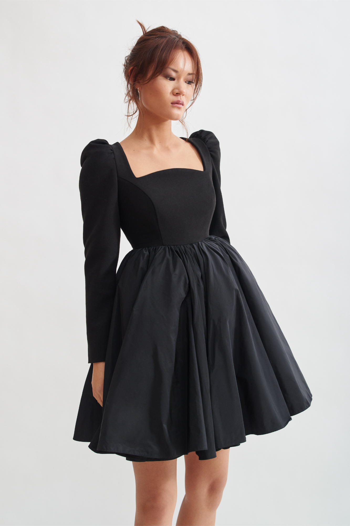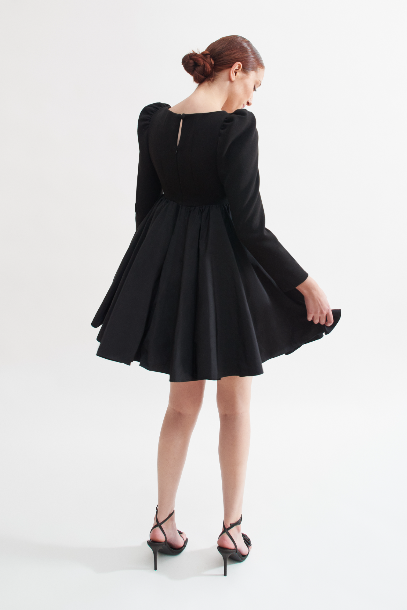 This elegant dress is made from a combination of crepe and taffeta fabrics, both in a deep black tone that gives it a sophisticated and timeless air. The crepe adds a soft, light texture to the dress, while the taffeta adds a touch of shine and structure.