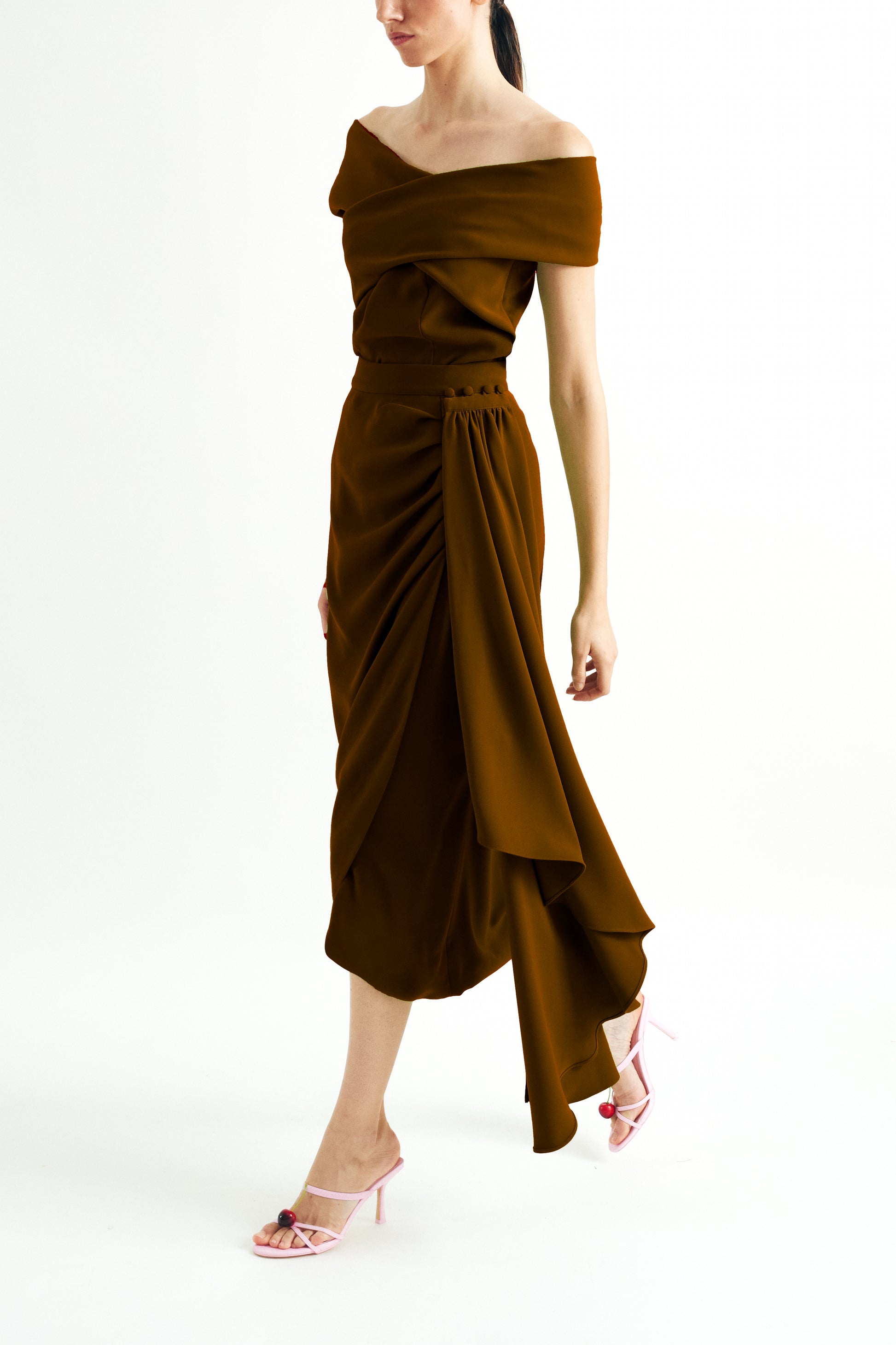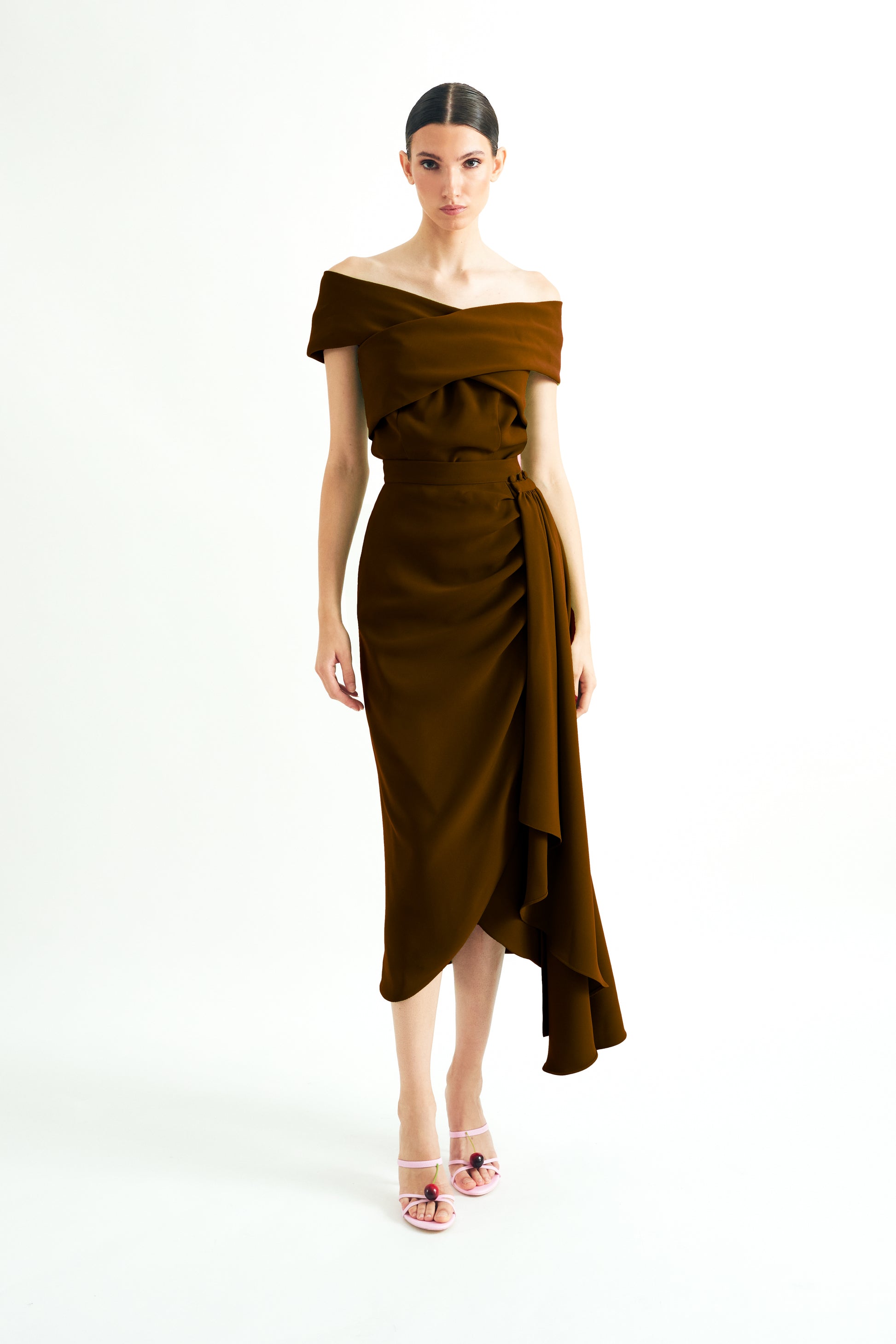 A top and skirt set crafted from mocha mousse crepe. The top features a crossover Bardot neckline that leaves the shoulders bare, providing elegance and modernity. The fitted skirt with front draping enhances the silhouette and is completed with a detachable overlay train, allowing you to transform the look from minimal to dramatic.