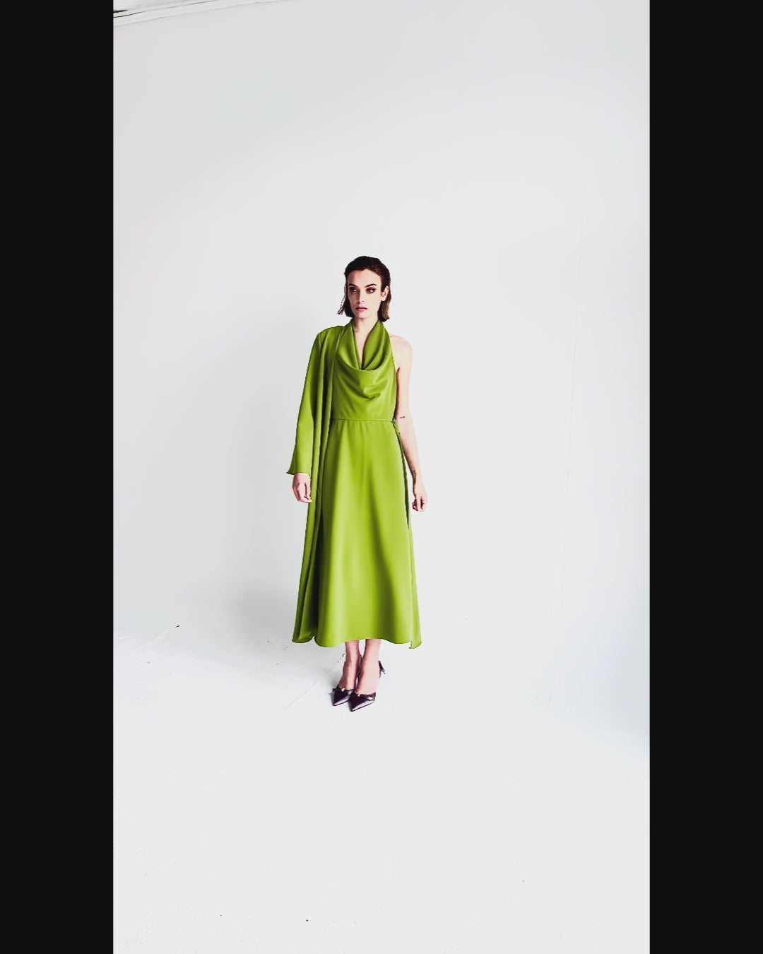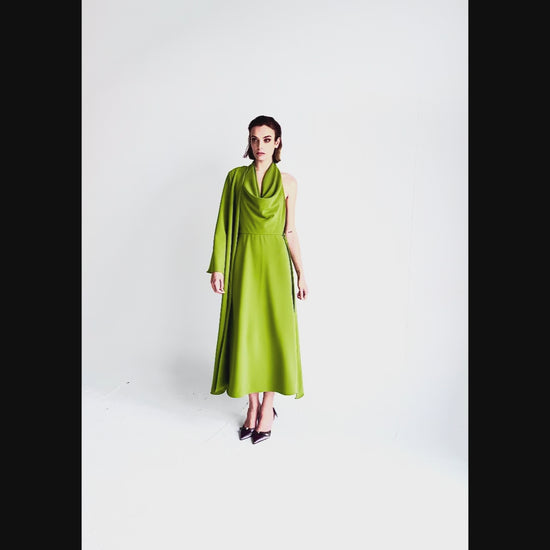 The Buria midi dress is crafted from flowing olive green crepe. Its design features a cascading side panel that adds volume, movement, and a unique touch. The crossover neckline and front darts enhance the bust, while the gently fitted silhouette flatters without being restrictive.