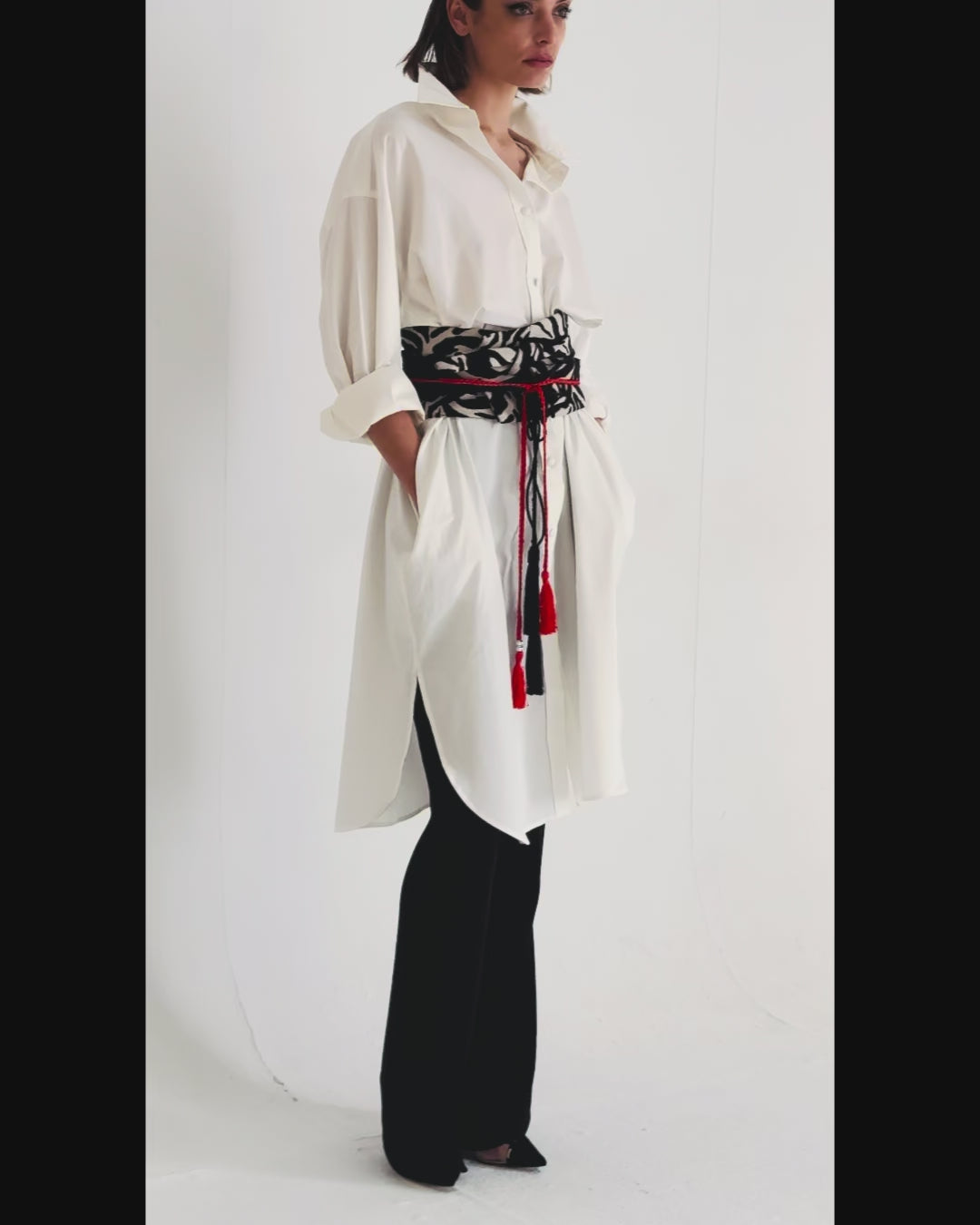 Germain shirt dress in white cotton poplin. It has a built-in belt to adjust the garment to the body. The Khnor sash shown in the photo is not included.
