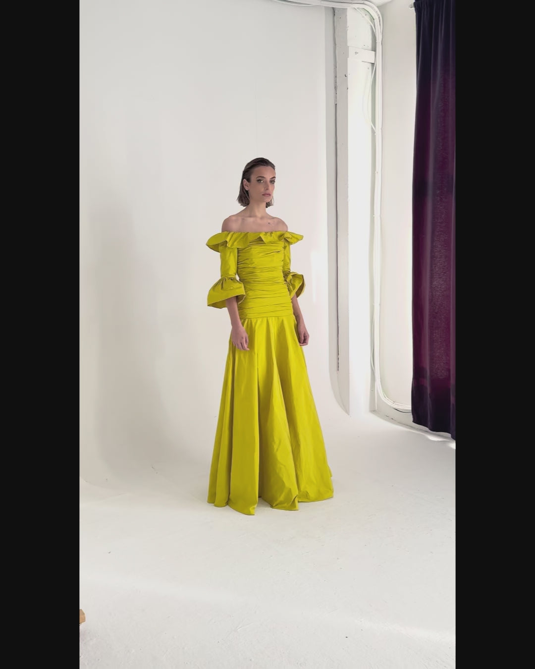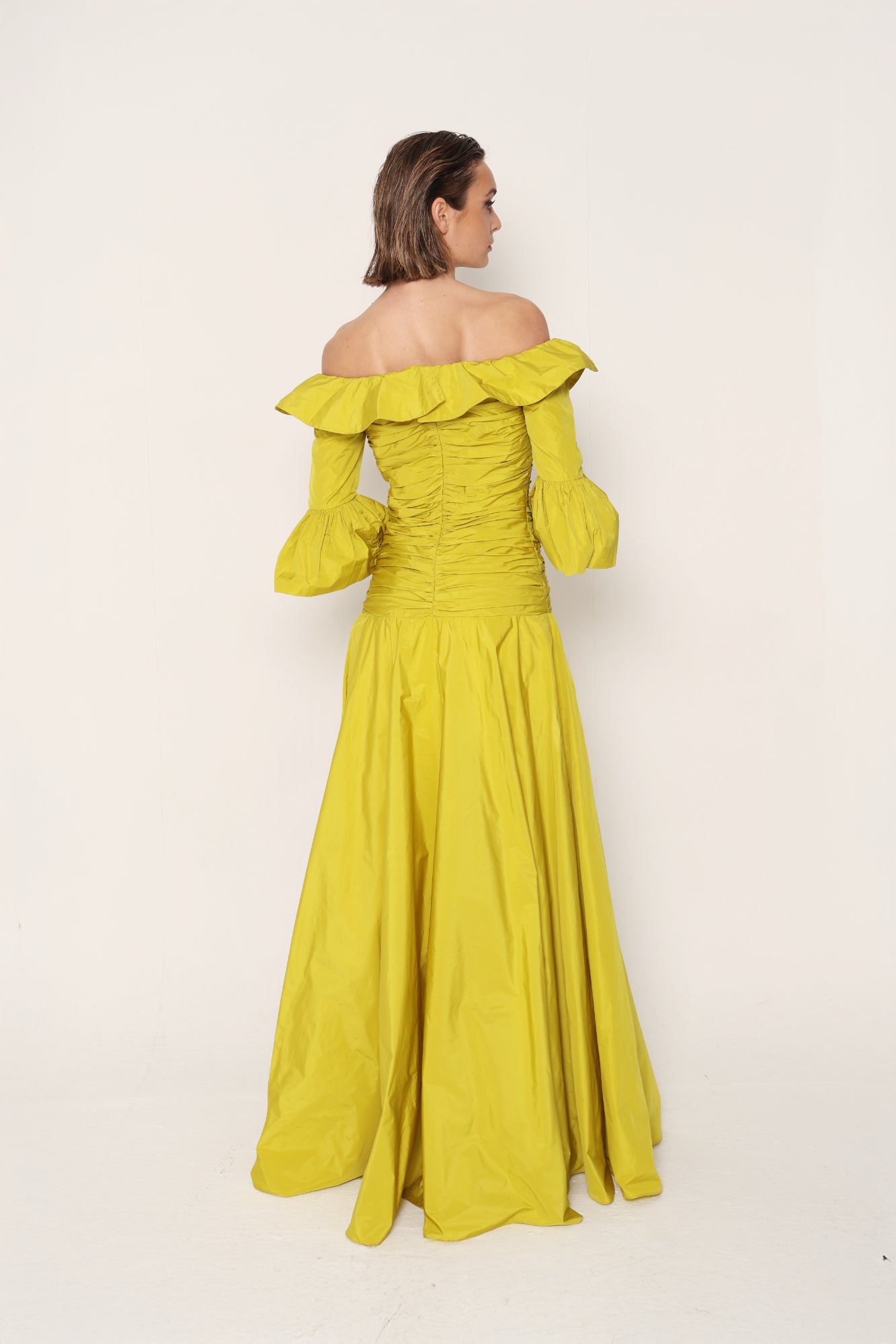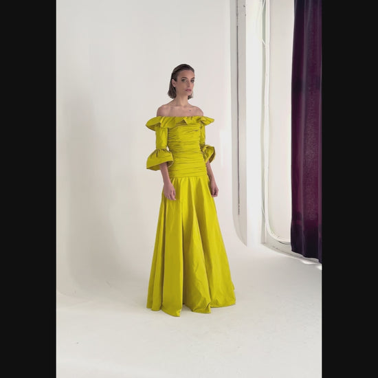 Fabiola long taffeta dress in lime green with Bardot neckline and adjustable balloon sleeves.