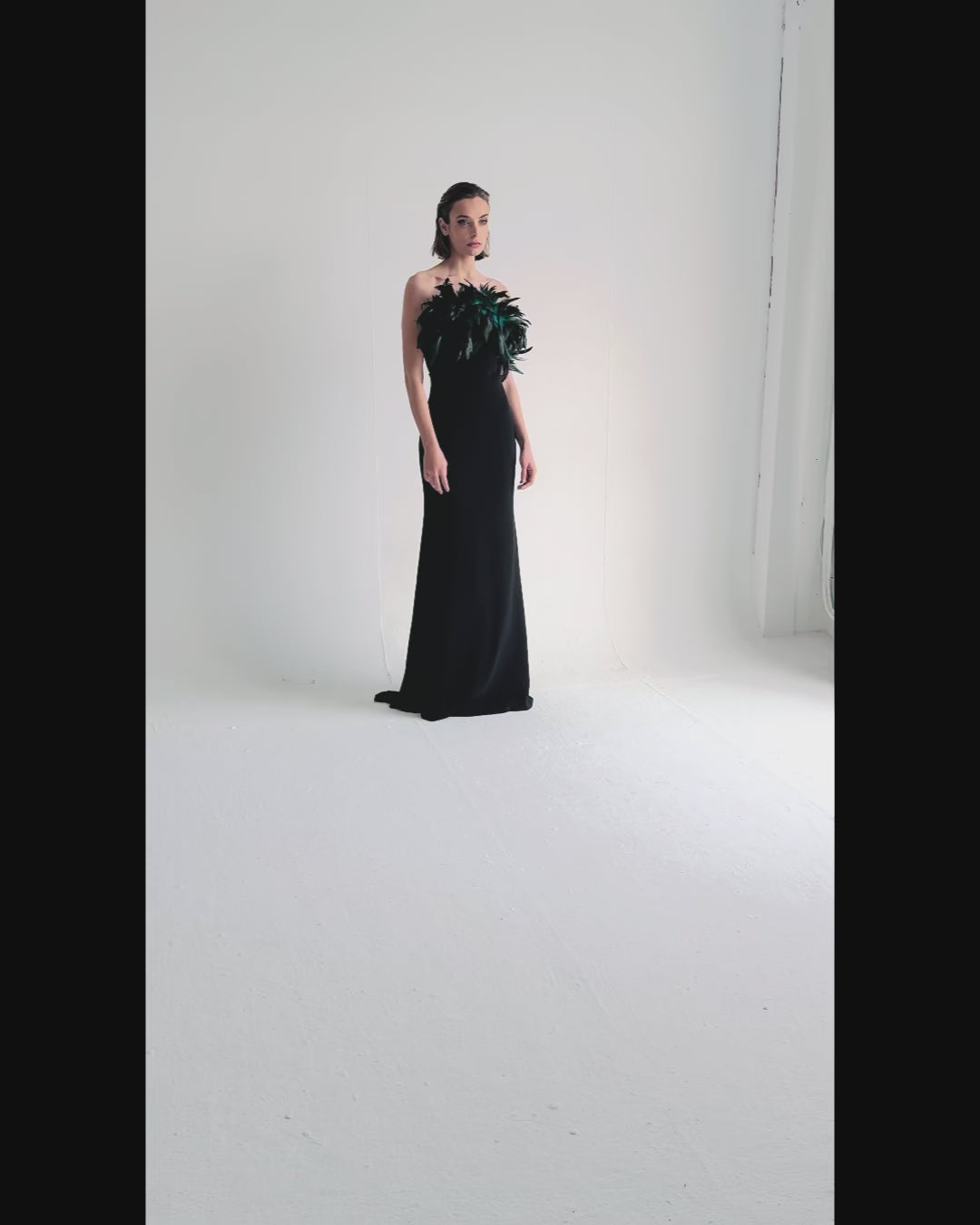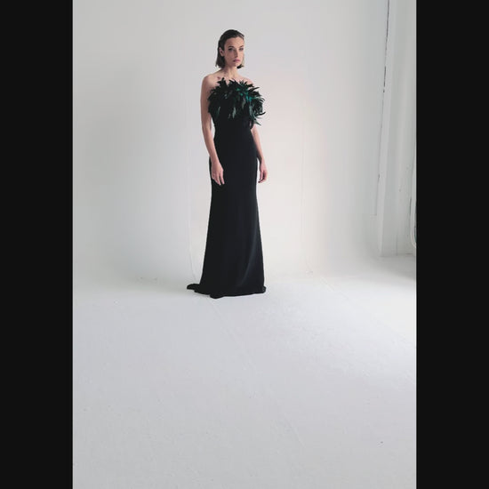 Goris dress, made of black crepe, with a semi-circular neckline adorned with green duck feathers. Mermaid cut with a train.