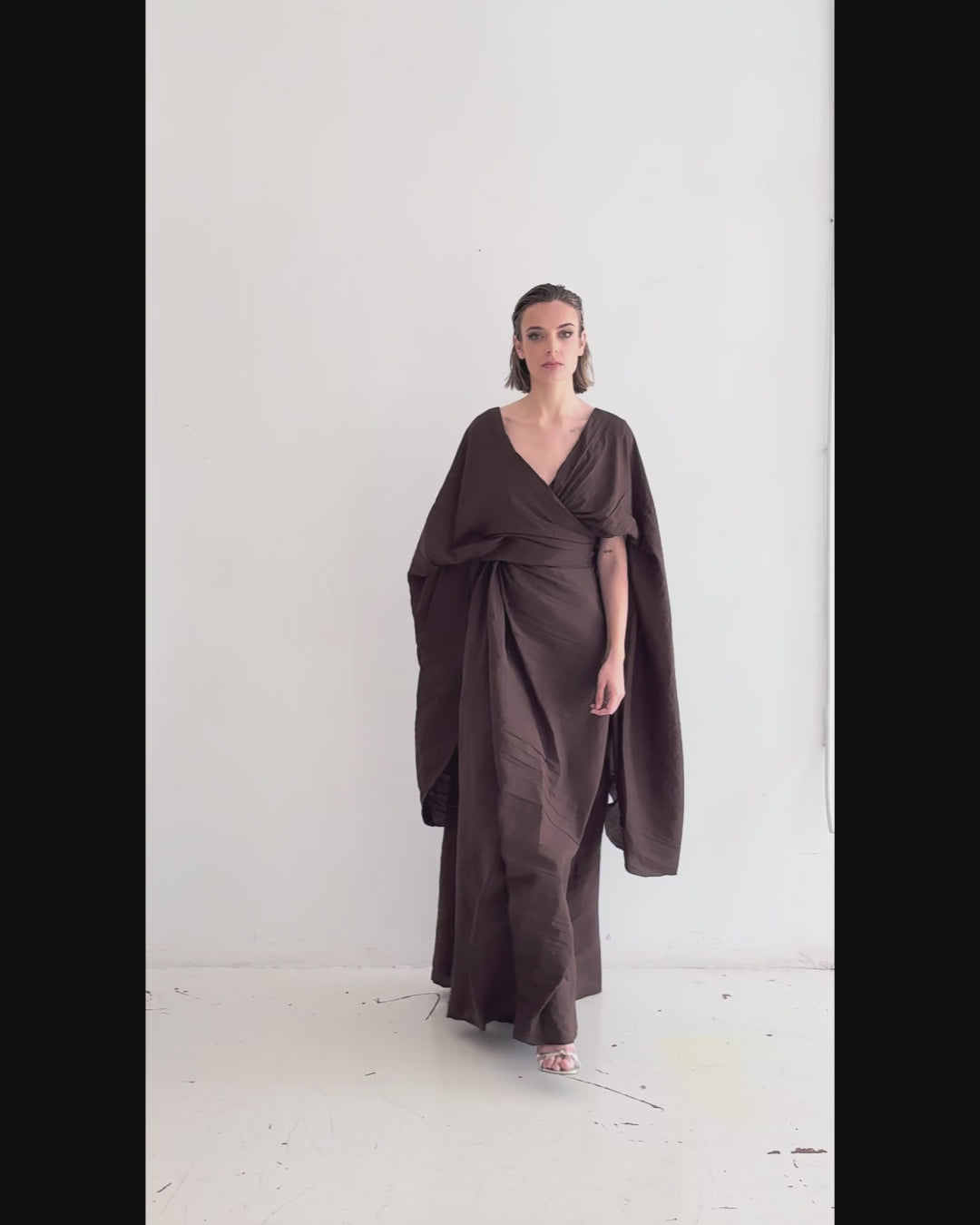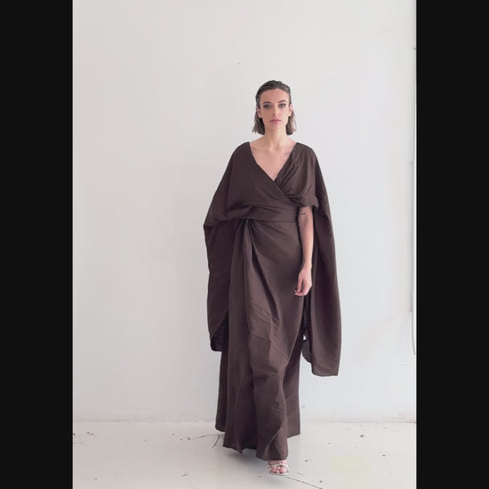 Nubar long pleated cotton dress in earth brown tone, with asymmetrical neckline both at the front and back.