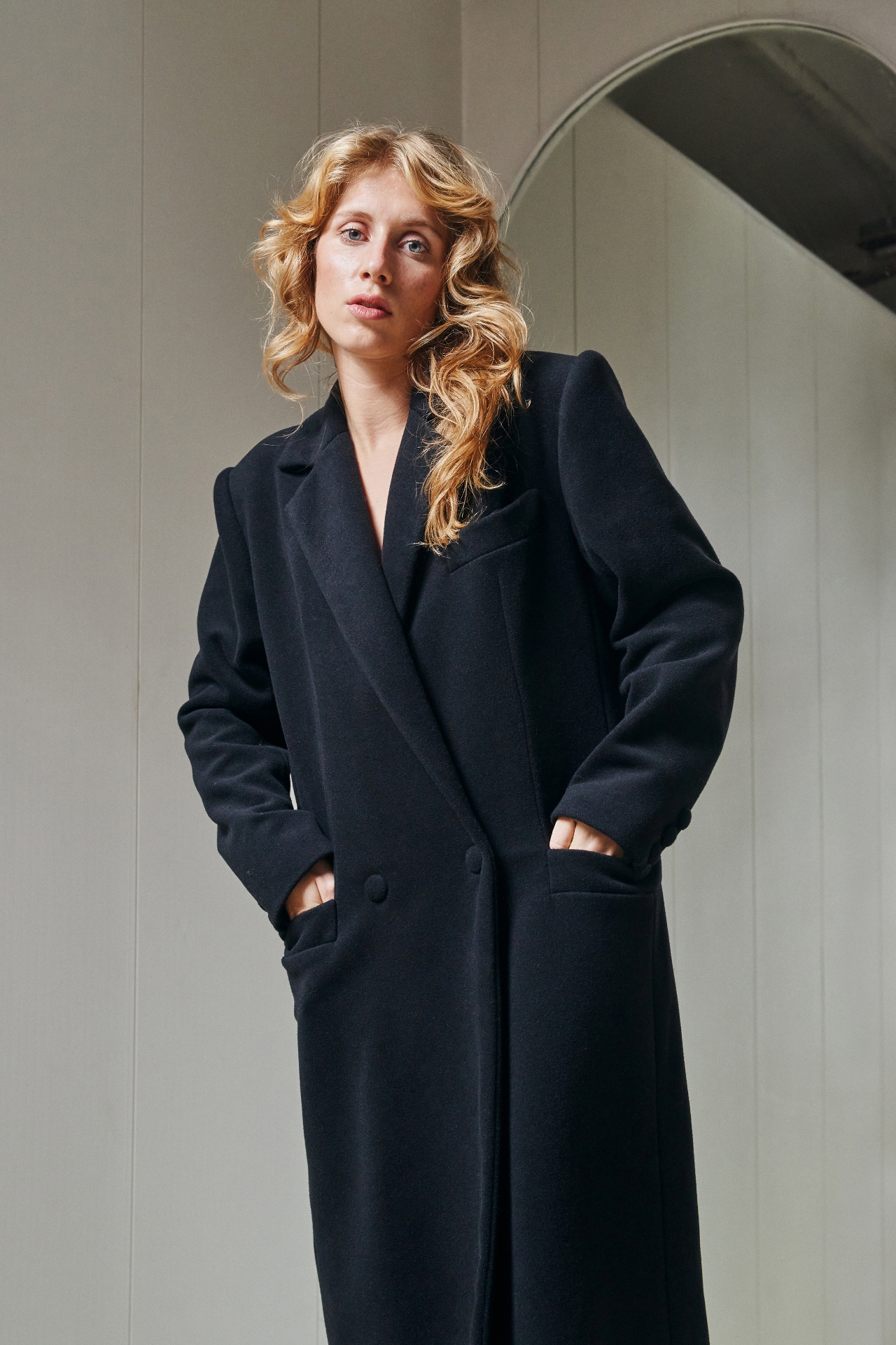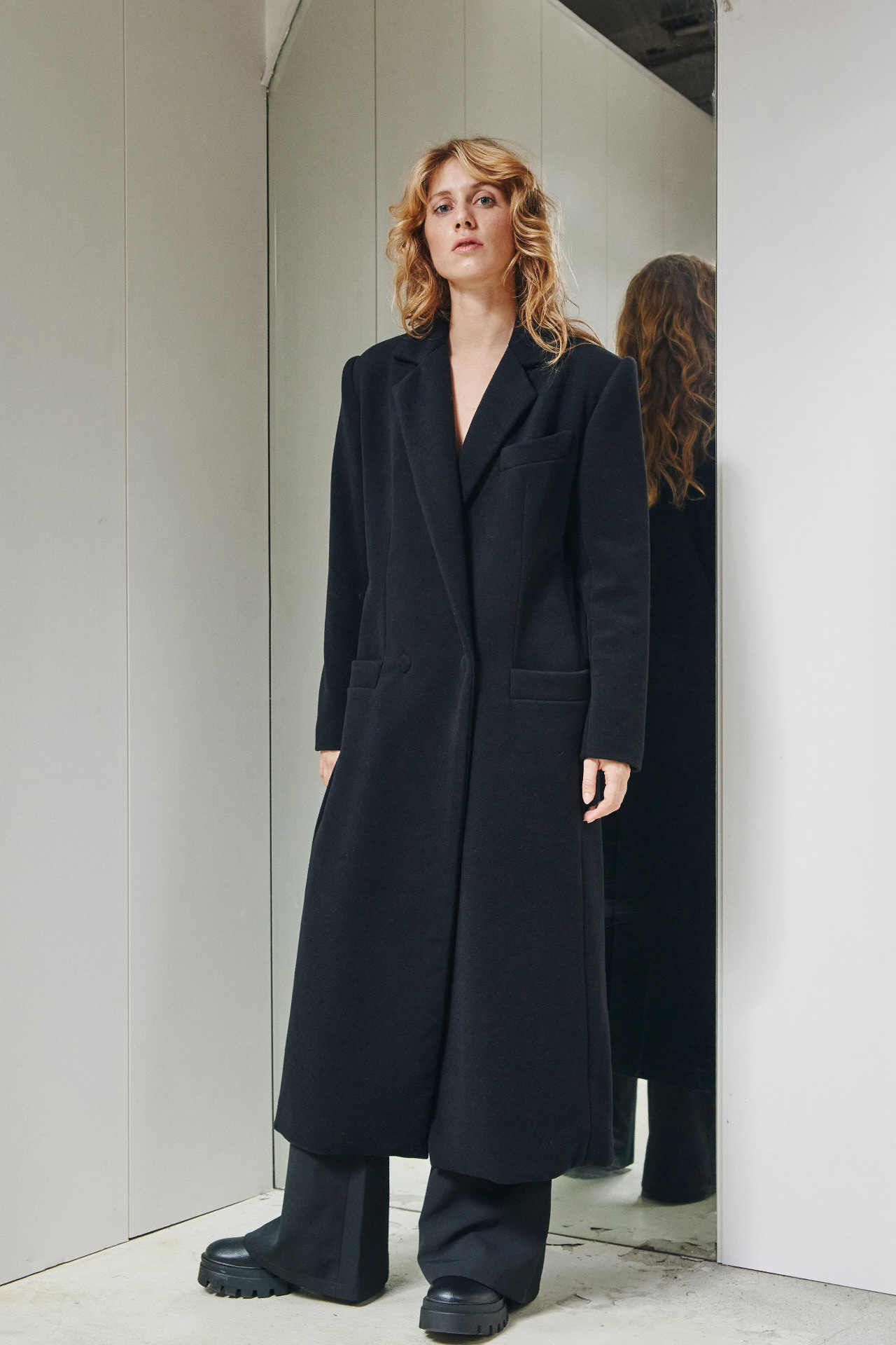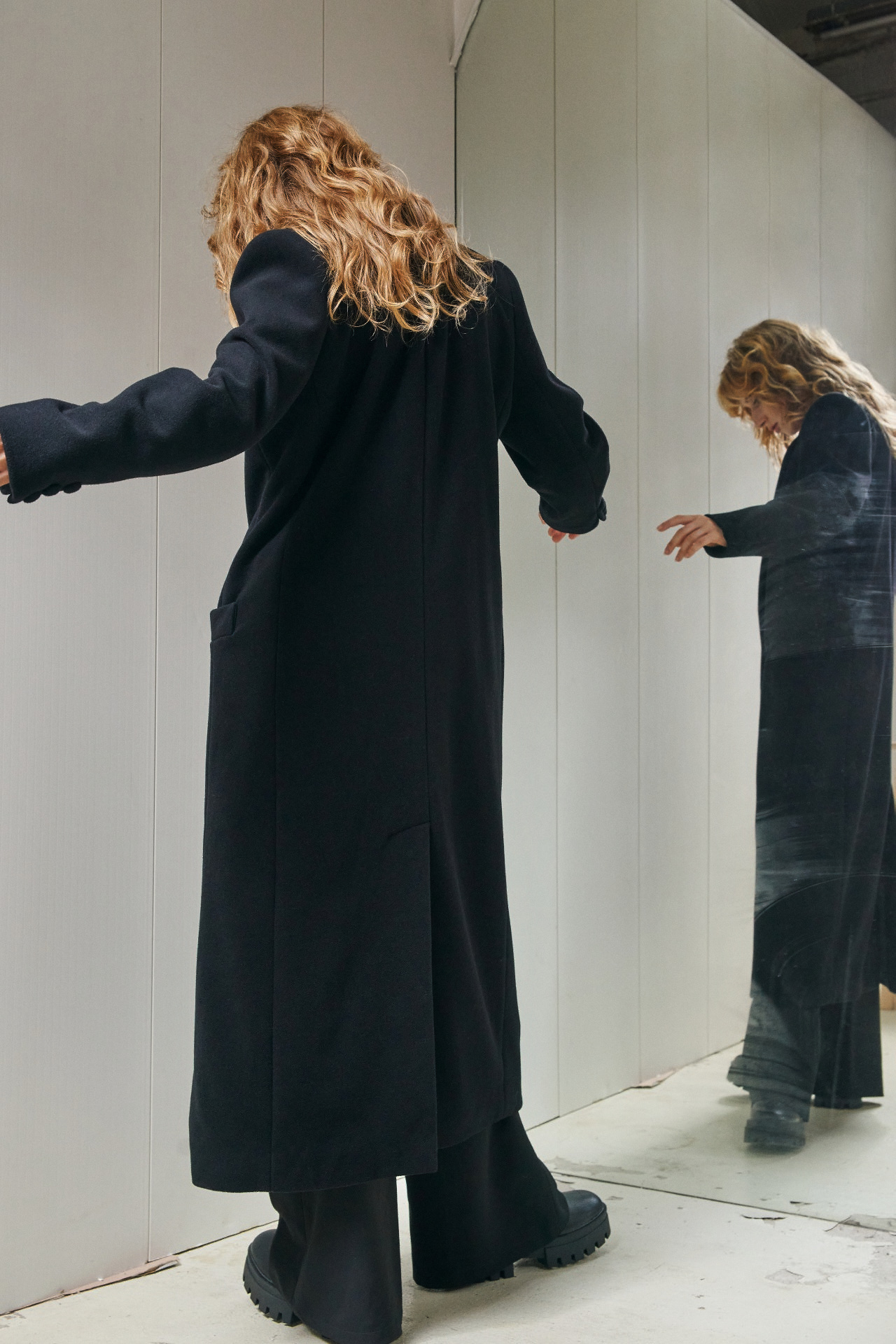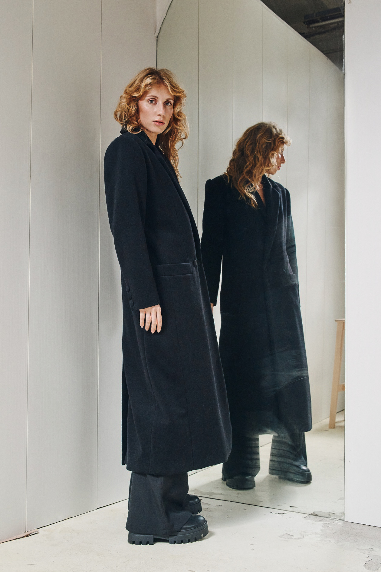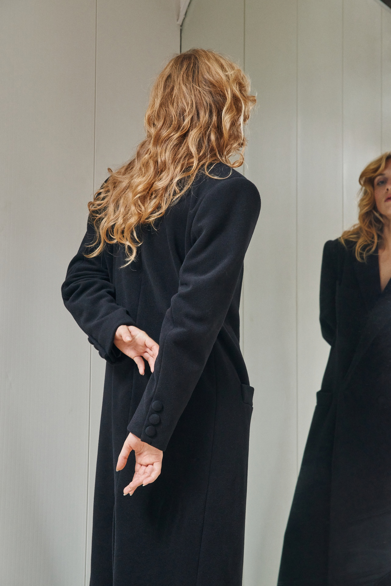 Abrigo largo de corte masculino oversize largo de lana y cashmere en color negro.