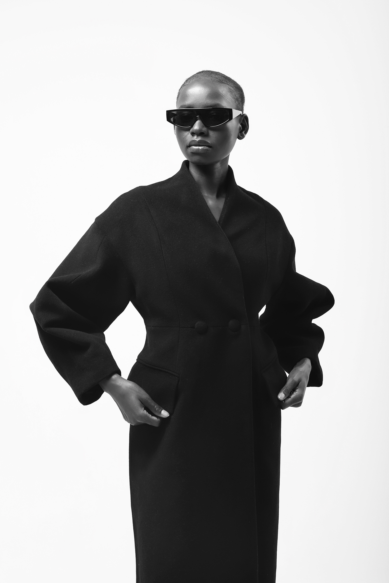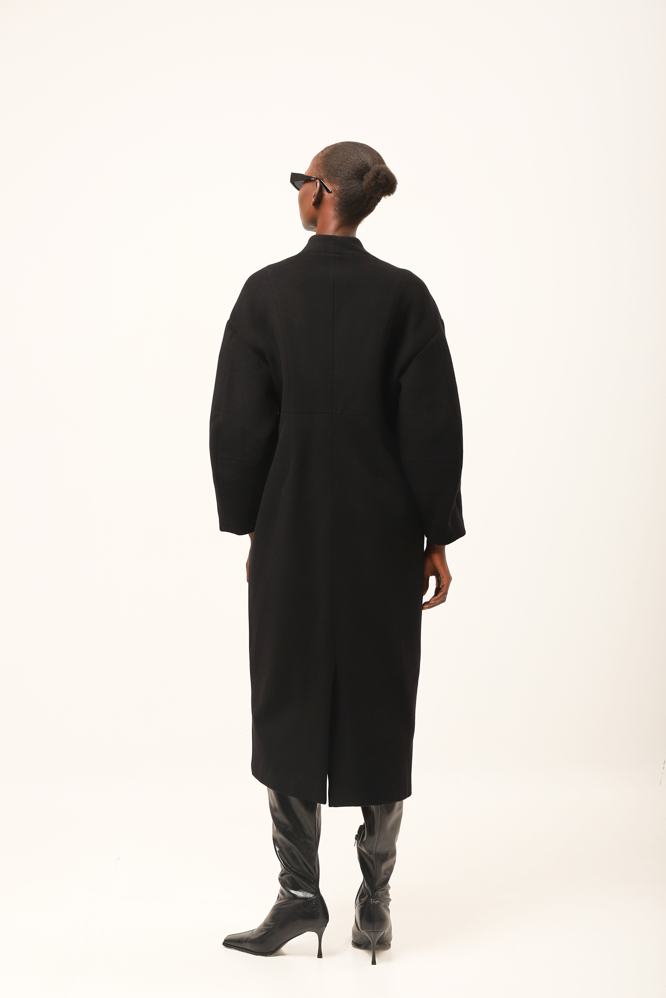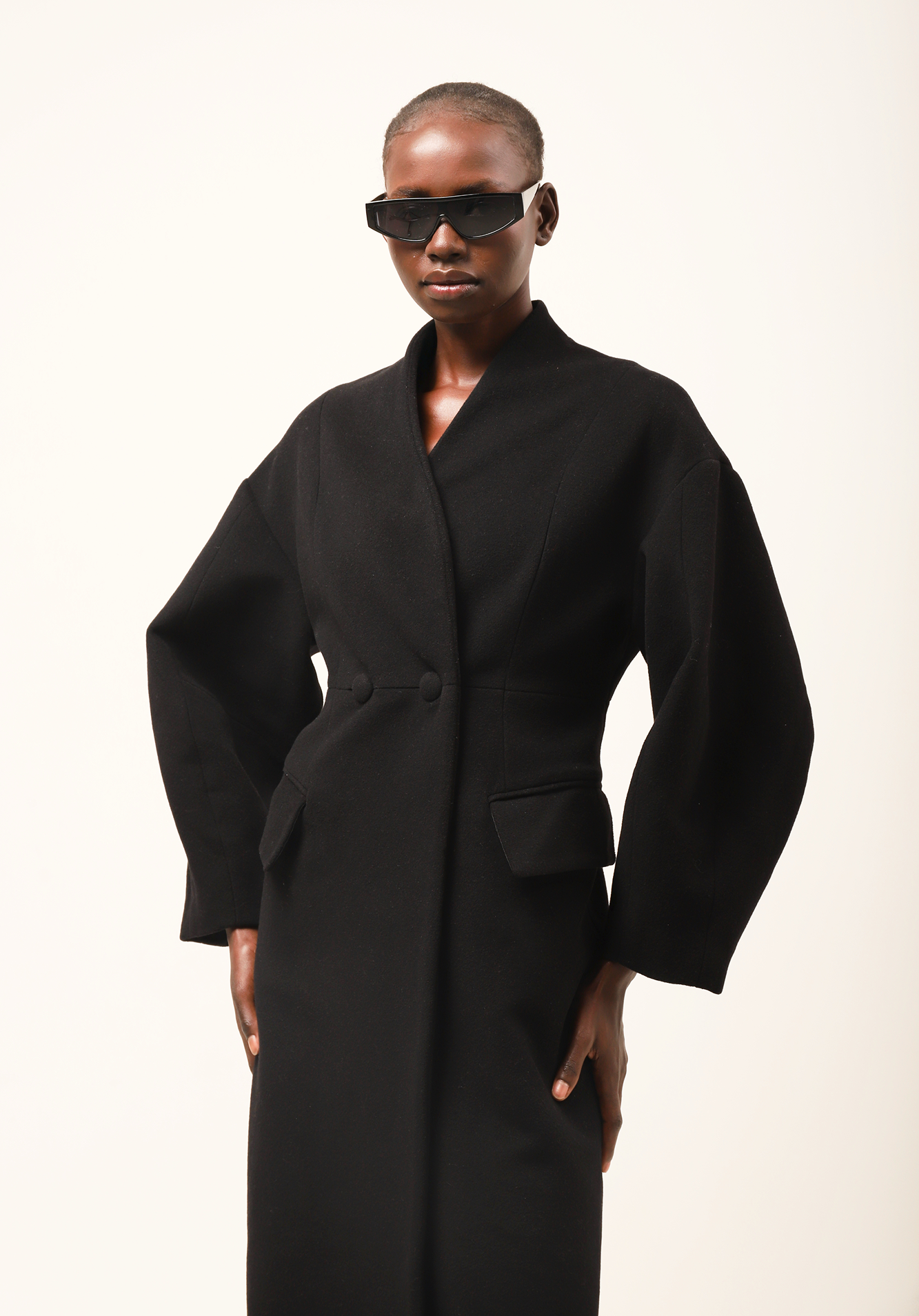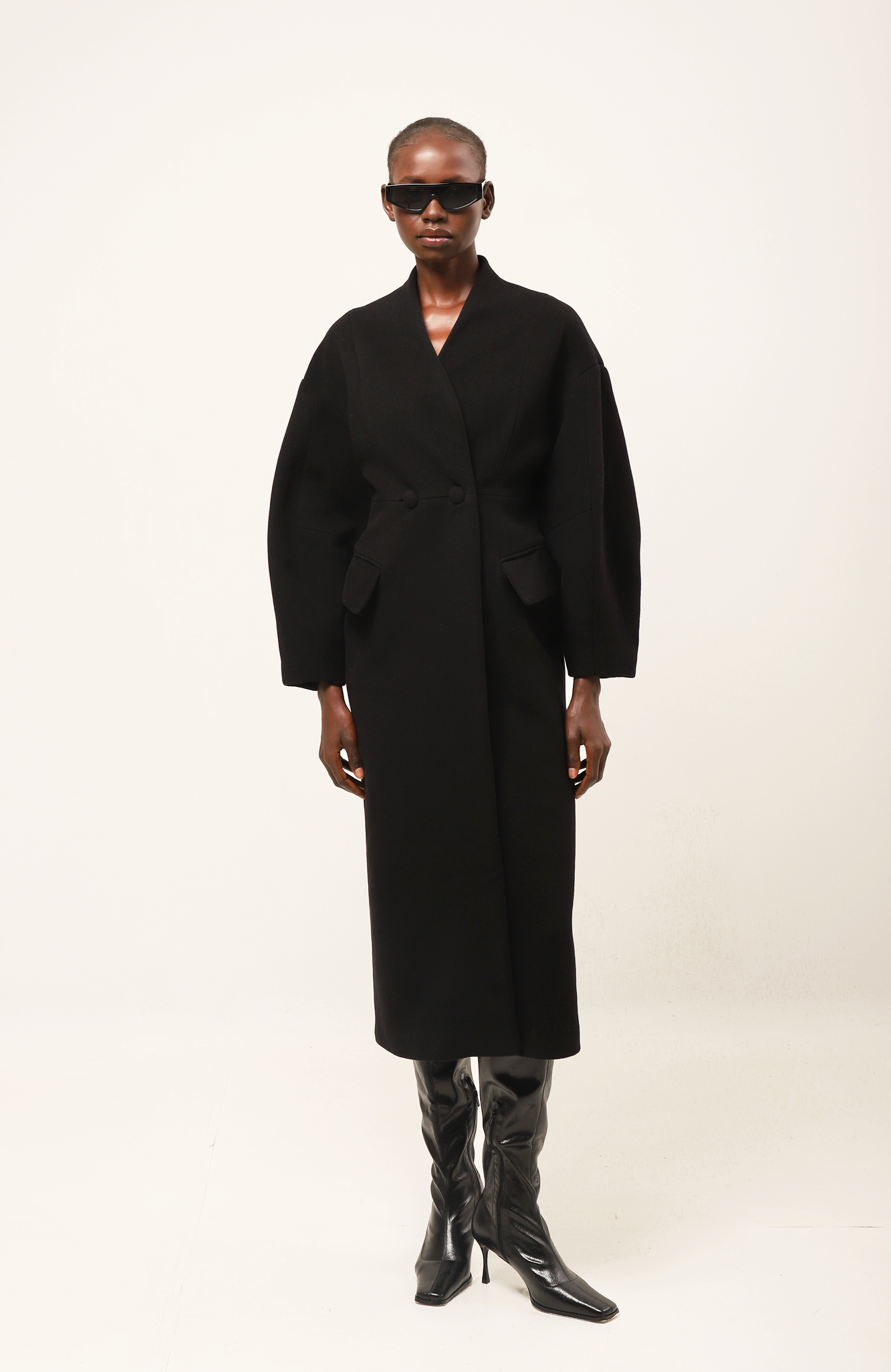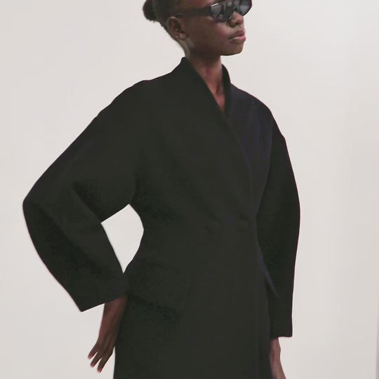 Abrigo de lana y cashmere en color negro. Corte estructurado, cierre cruzado con bolsillos forrados y sin solapas. Fruncido en la cintura para estilizar la figura y largo hasta los pies. Mangas abullonadas y bolsillos laterales con solapas vistas.