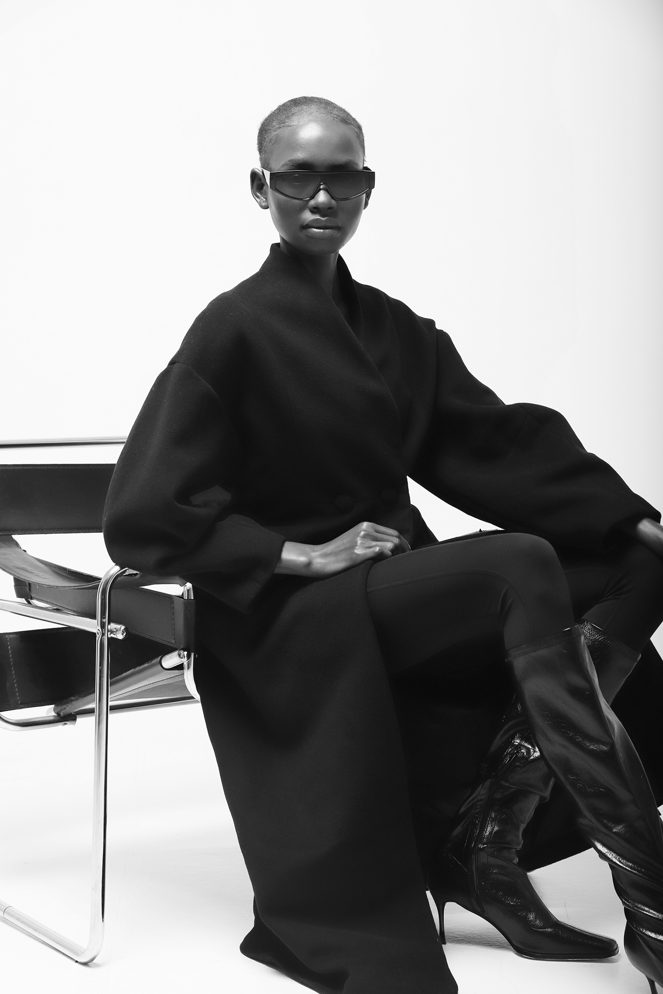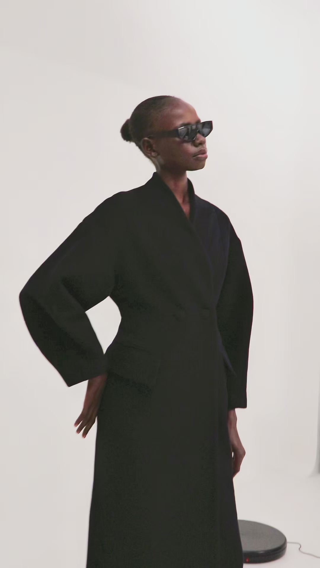 Abrigo de lana y cashmere de corte estructurado en color negro con bolsillos y de largo hasta el tobillo.
