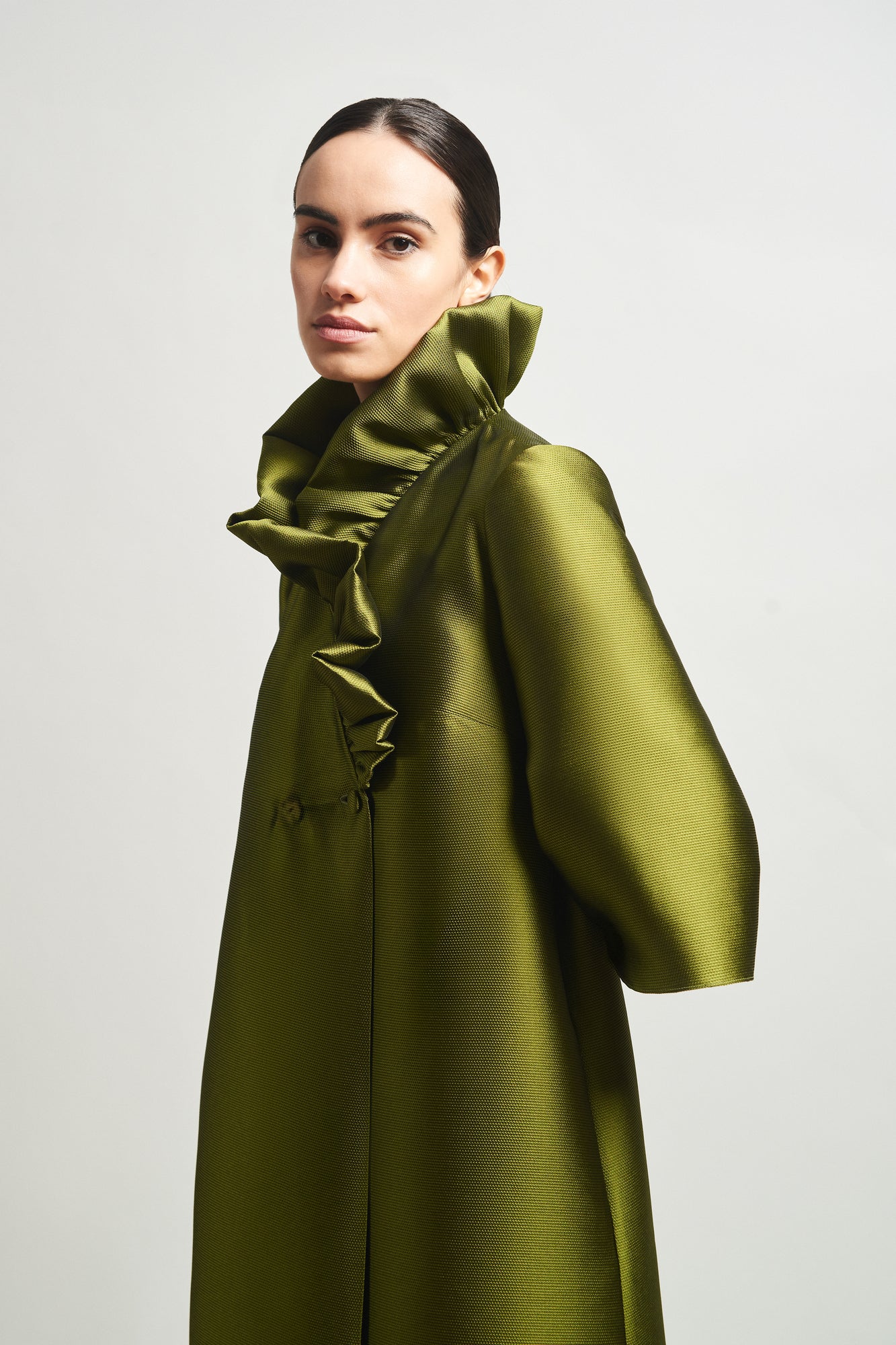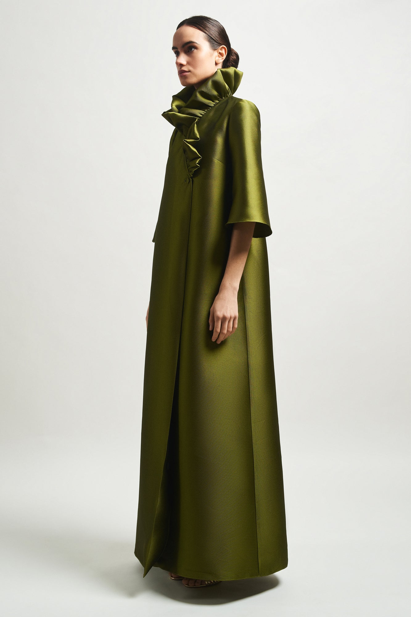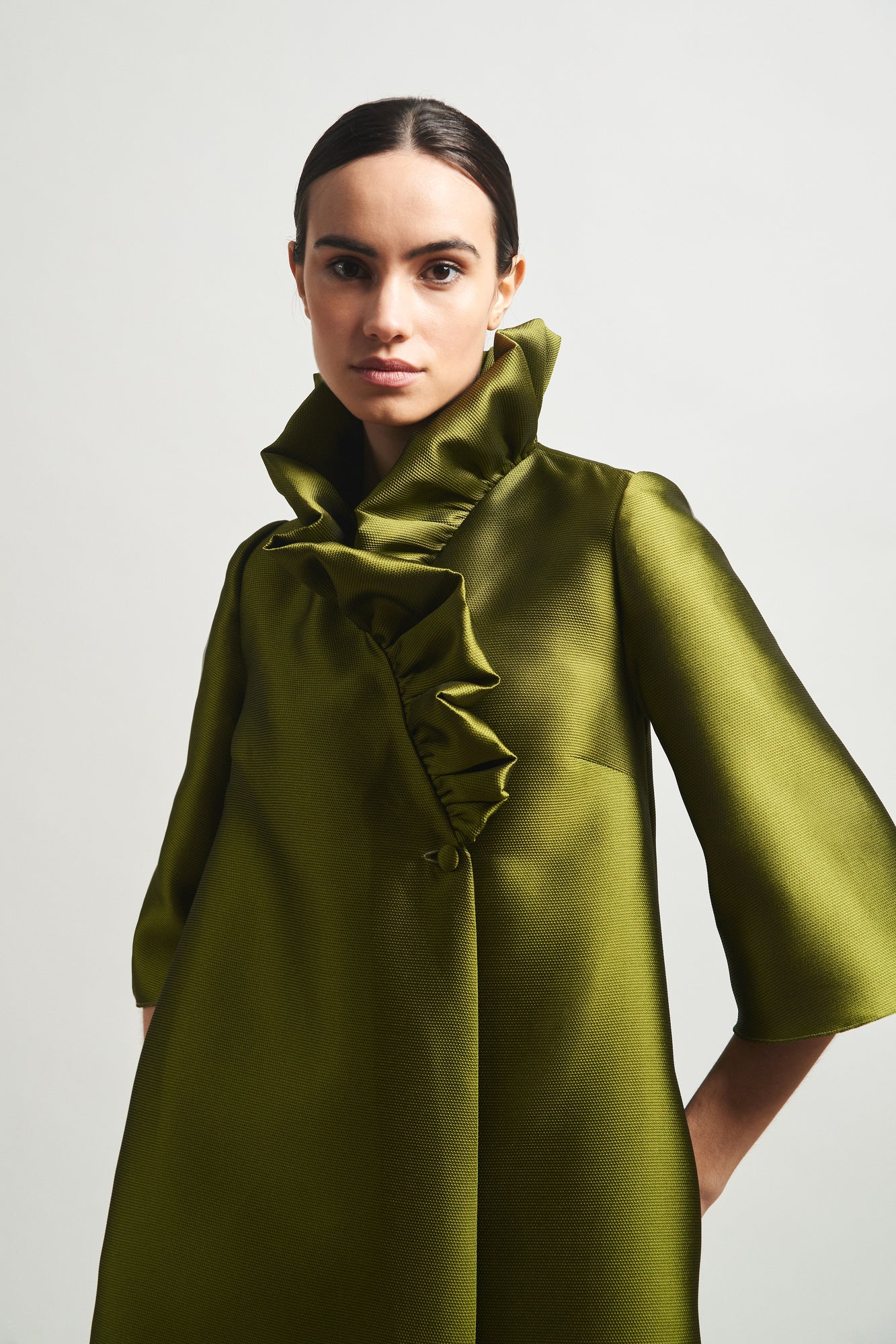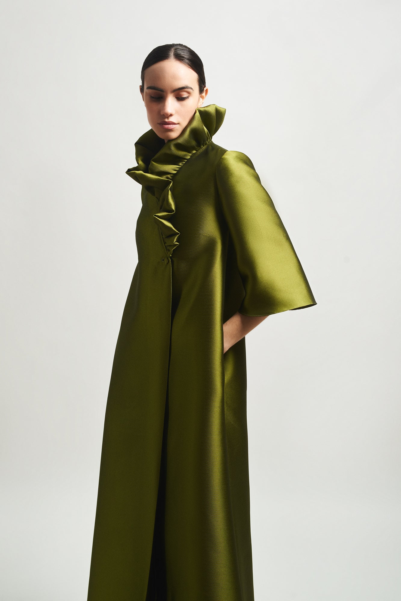 El corte, de silueta amplia, fluye con la gravedad majestuosa de lo inevitable. Las mangas ¾ dejan entrever las muñecas como si fueran armas de elegancia. El cuello de volantes se alza como un poema que se escribe en el aire, palabra a palabra, sin necesidad de firmarlo.