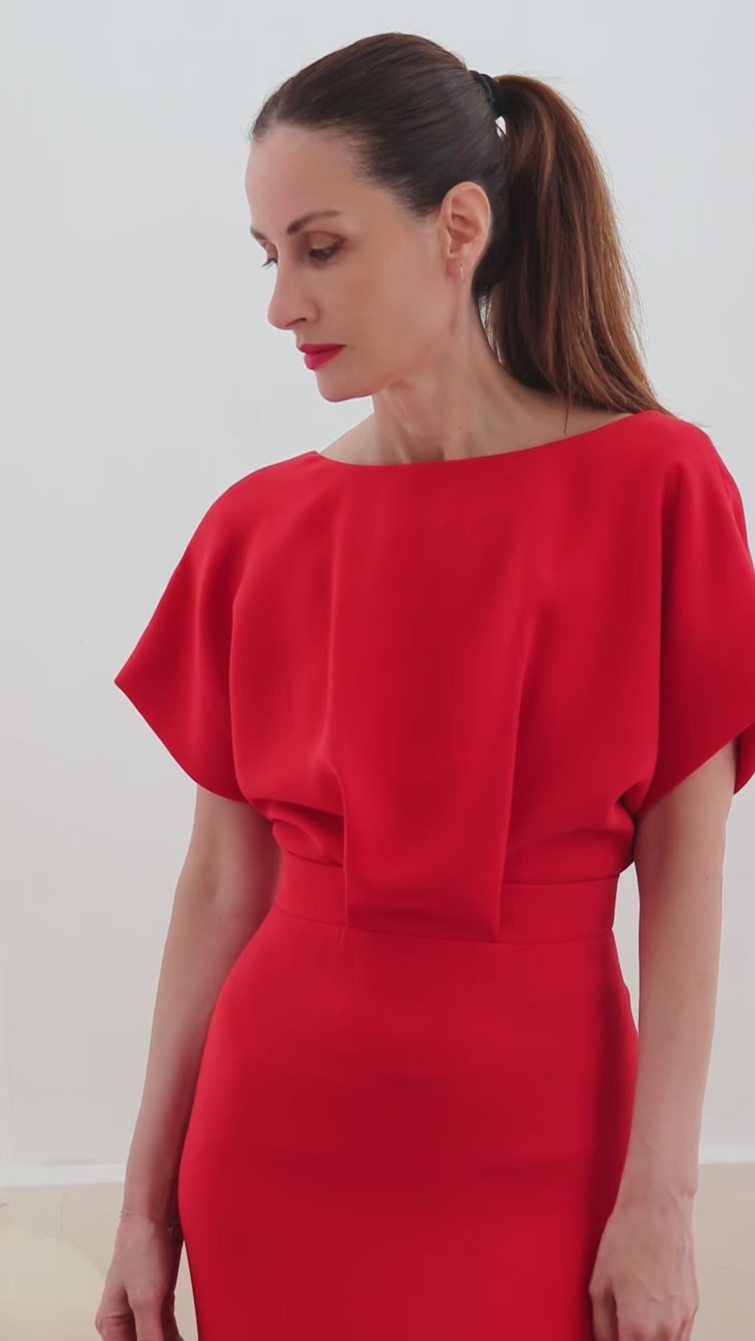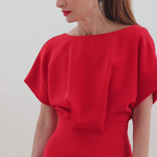 Vestido largo de corte sirena realizado en nuestro crepe rojo. Cortado por la cintura, con la parte superior con dos pliegues y escote en la espalda. Es el vestido perfecto para resaltar la figura.