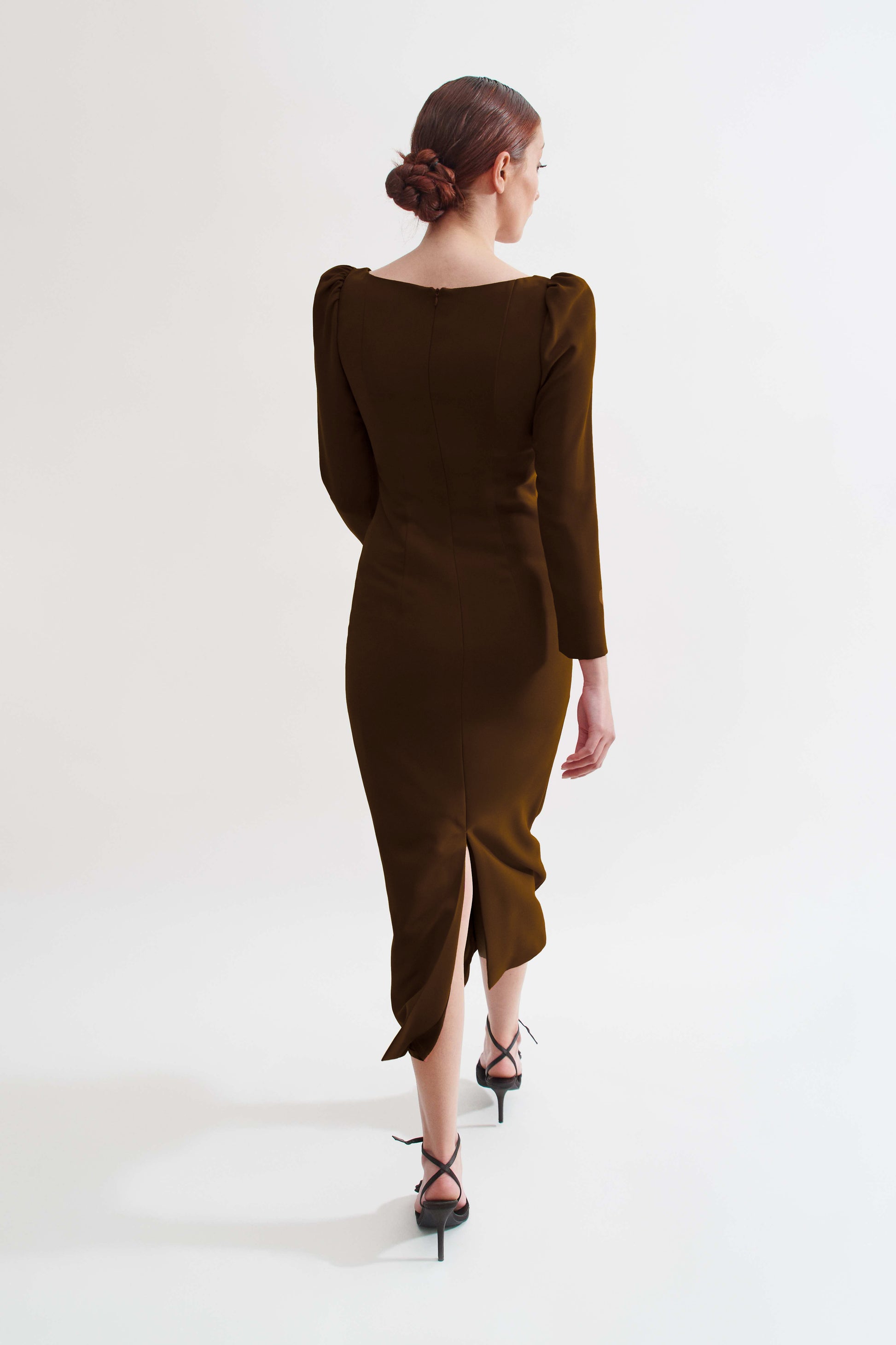 Vestido confeccionado en crepe mocha mousse, con un escote de media luna que enmarca el busto con sutil delicadeza y una manga larga ligeramente estructurada que estiliza el brazo y aporta equilibrio al conjunto. De silueta entallada y largo midi, dibuja la figura con una sofisticación serena y sin esfuerzo.