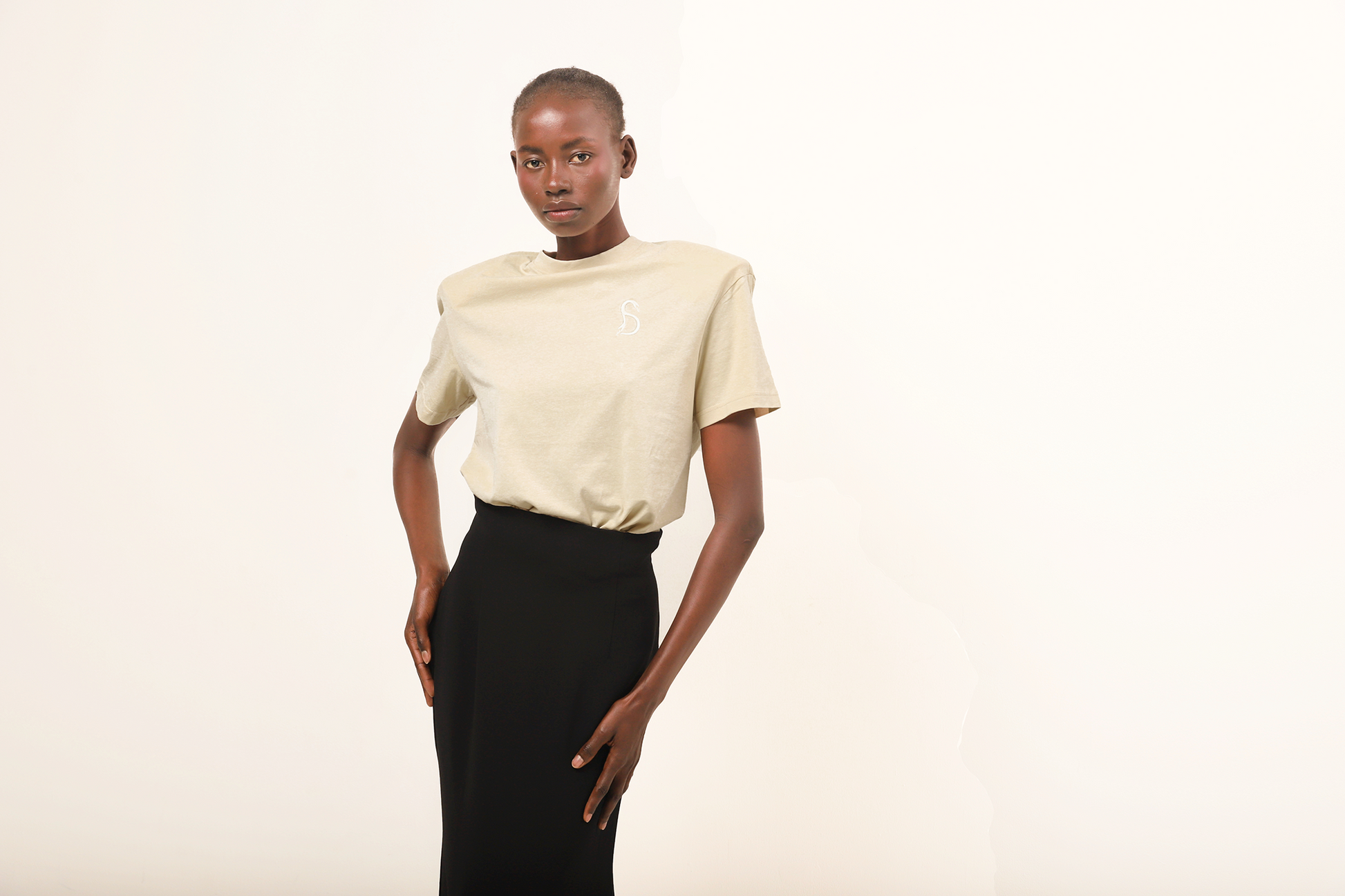 Camiseta de algodón de color beige, con hombreras de quita y pon y logo bordado al tono en la parte frontal. Corte oversize que aporta comodidad y estilo.