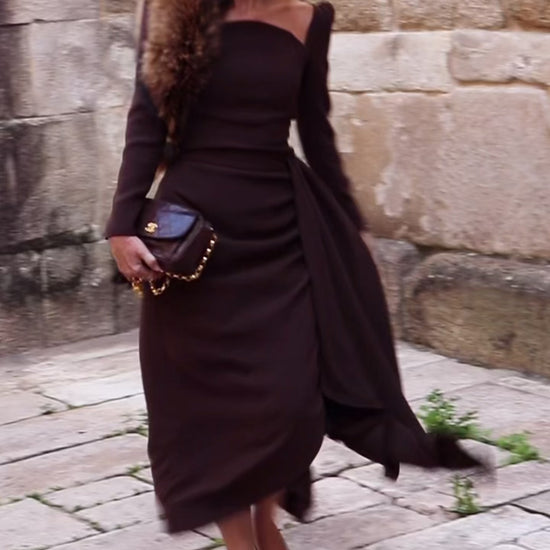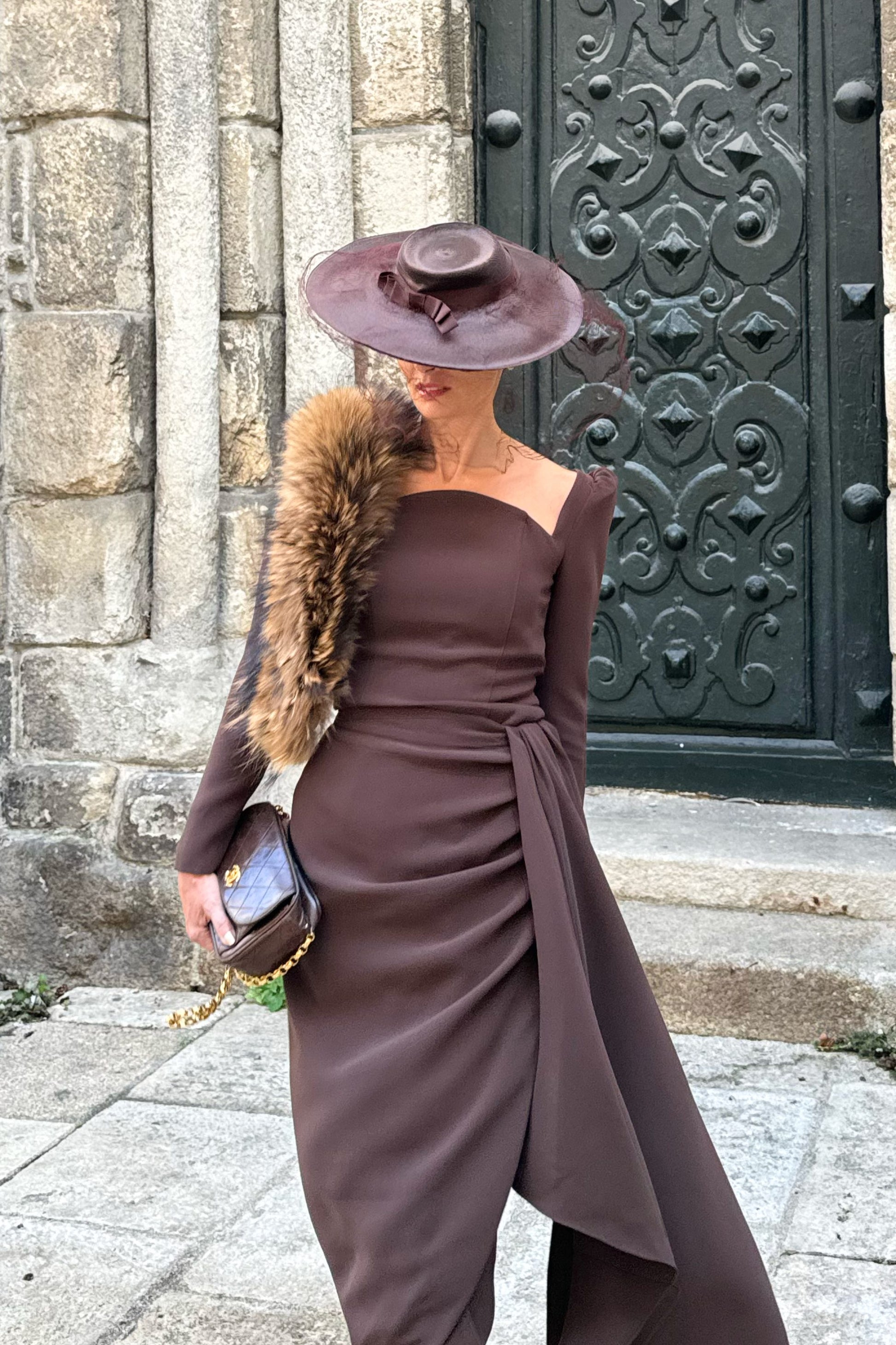 Conjunto de top y falda confeccionado en crepe mocha mousse. El top presenta un escote semicircular que muestra las clavículas, aportando elegancia y modernidad. La falda entallada con drapeado frontal realza la silueta y se completa con una cola superpuesta de quita y pon, que permite transformar el look según el momento: más minimal o más espectacular.