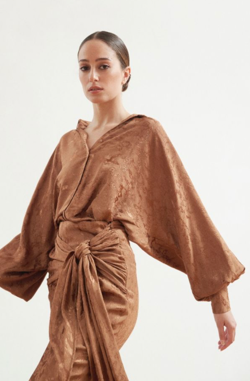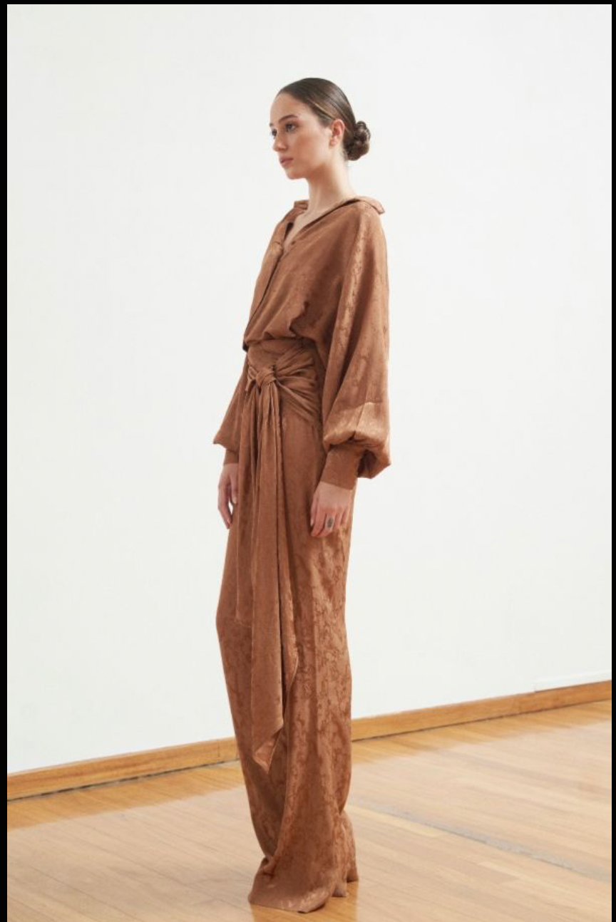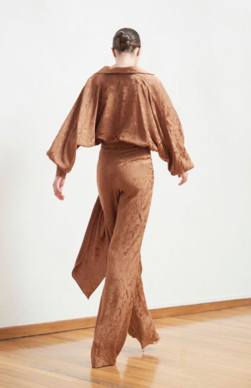 Conjunto de blusa pantalón palazzo en viscosa jacquard marrón. Blusa oversize y pantalón con drapeado en la cintura.