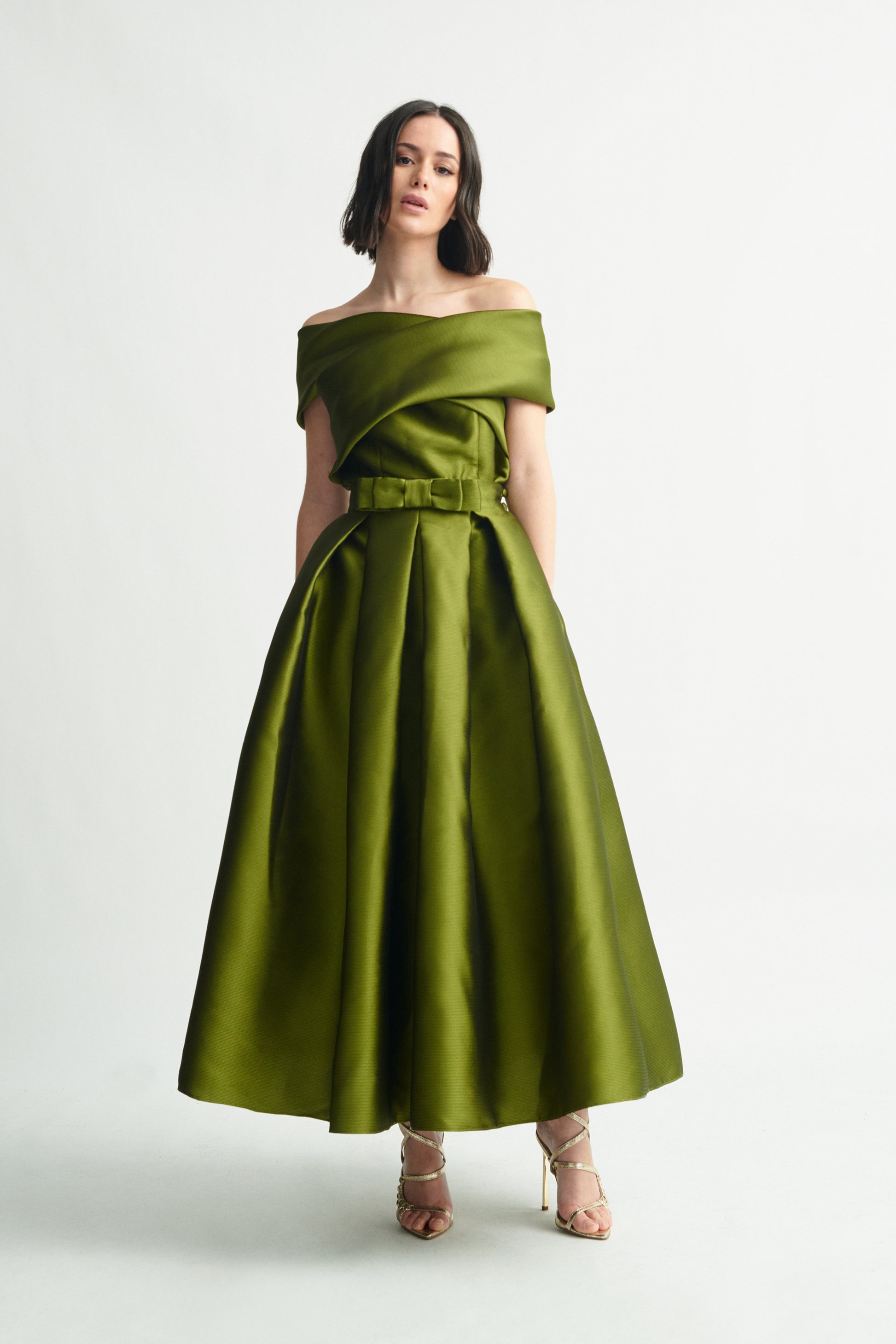 Bodas de tarde o noche, eventos especiales, fiestas y cenas formales donde se busca un look de invitada sofisticado y con personalidad. Favorece tanto a mujeres con mucho pecho como con poco, gracias a la estructura del escote que estiliza y equilibra la silueta.