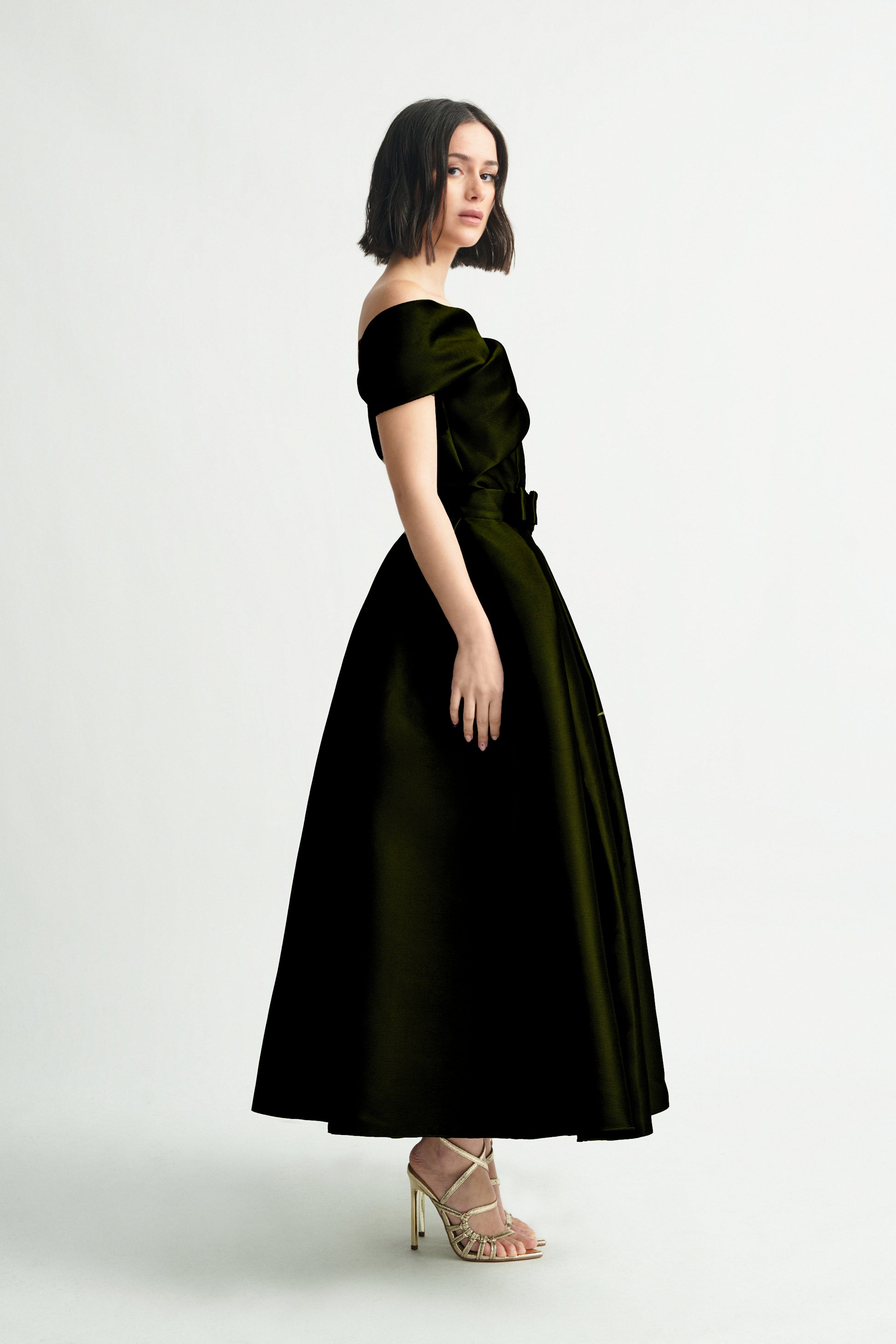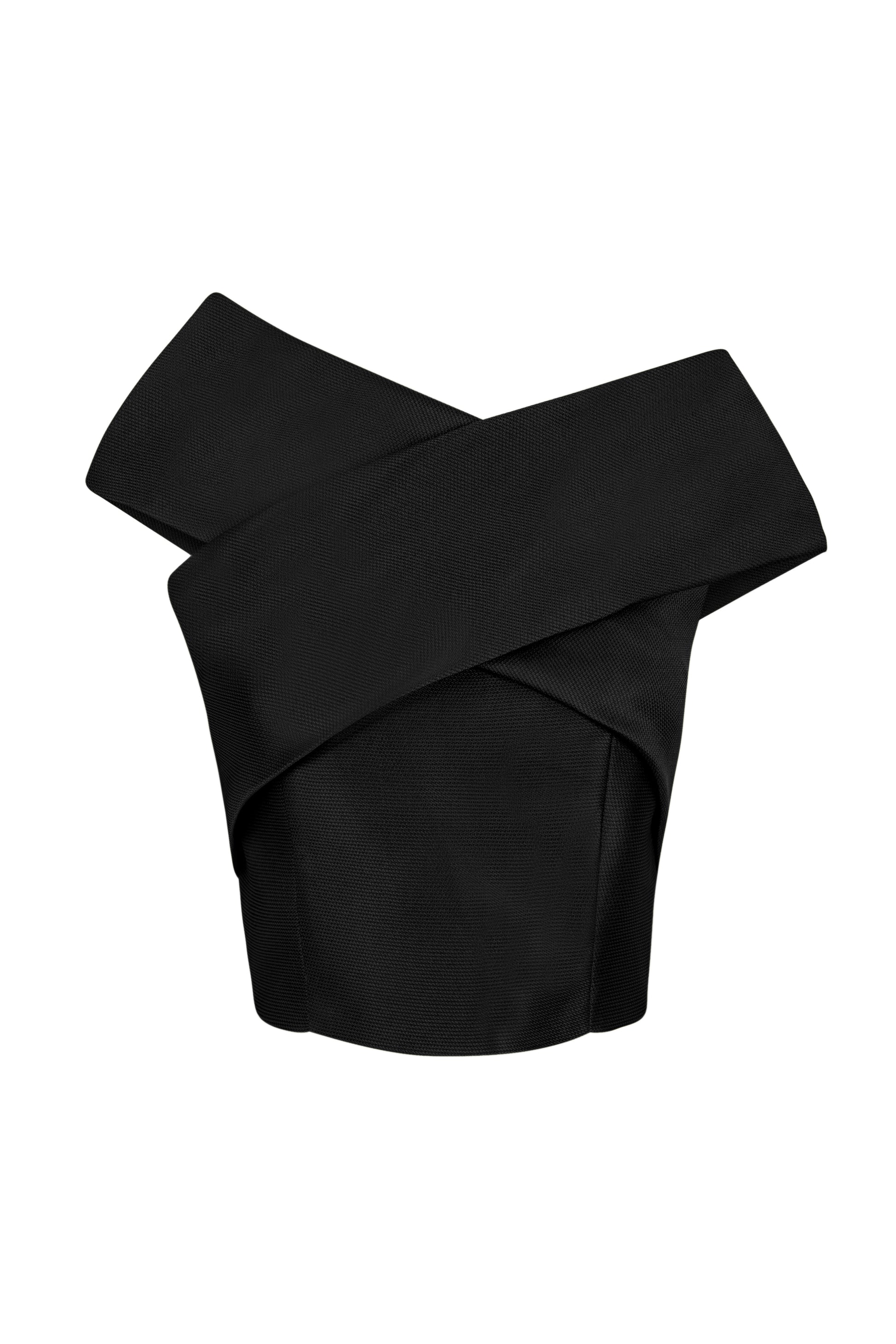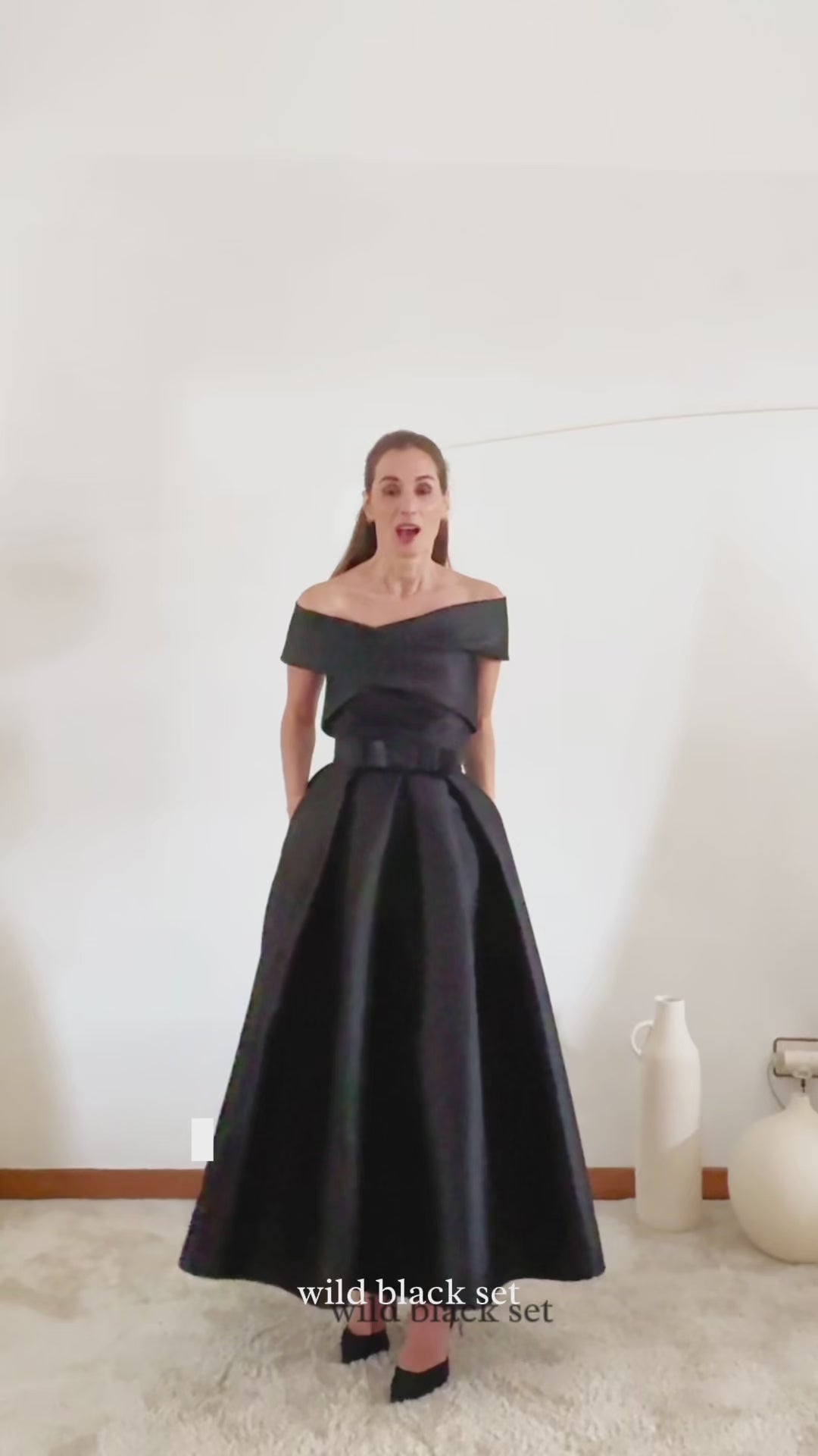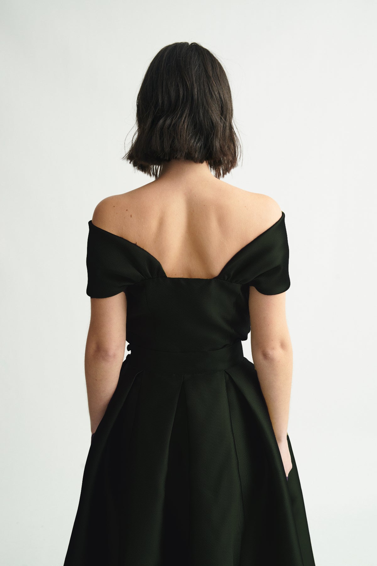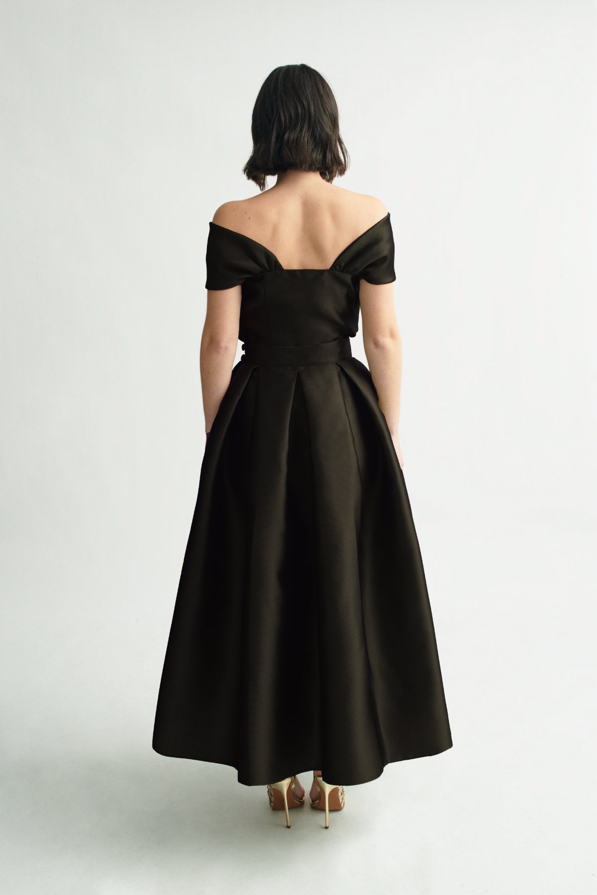 Conjunto de top y falda en tussord de seda negra, pensado para hacer una entrada inolvidable. El top, con escote cruzado tipo bardot, abraza los hombros con una estructura casi escultórica, resaltando la elegancia clásica con una silueta de líneas puras y envolventes. La falda, de volumen generoso y movimiento etéreo, incorpora bolsillos ocultos y un delicado lazo zapatero de quita y pon que añade un toque coquette lleno de encanto.