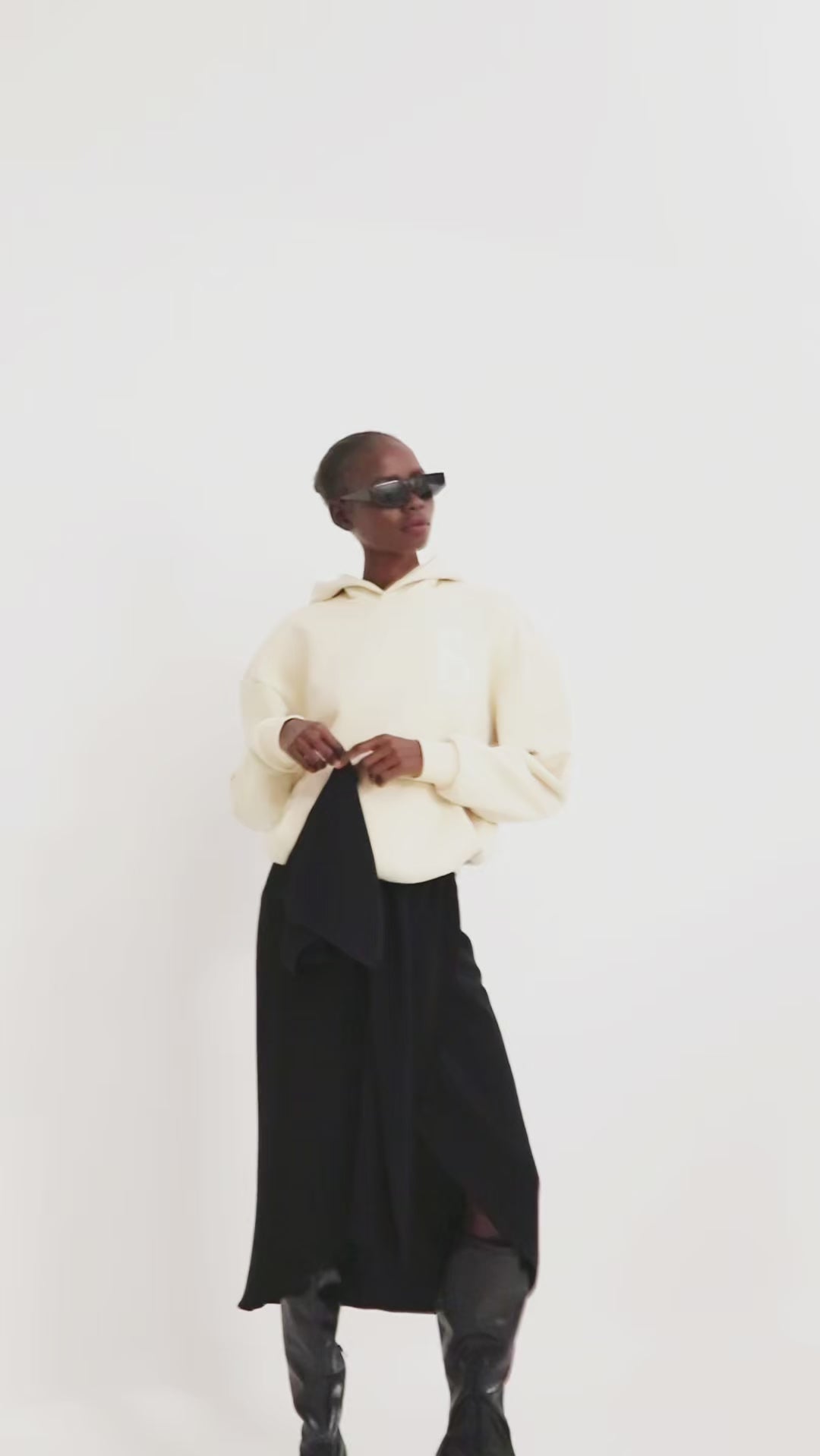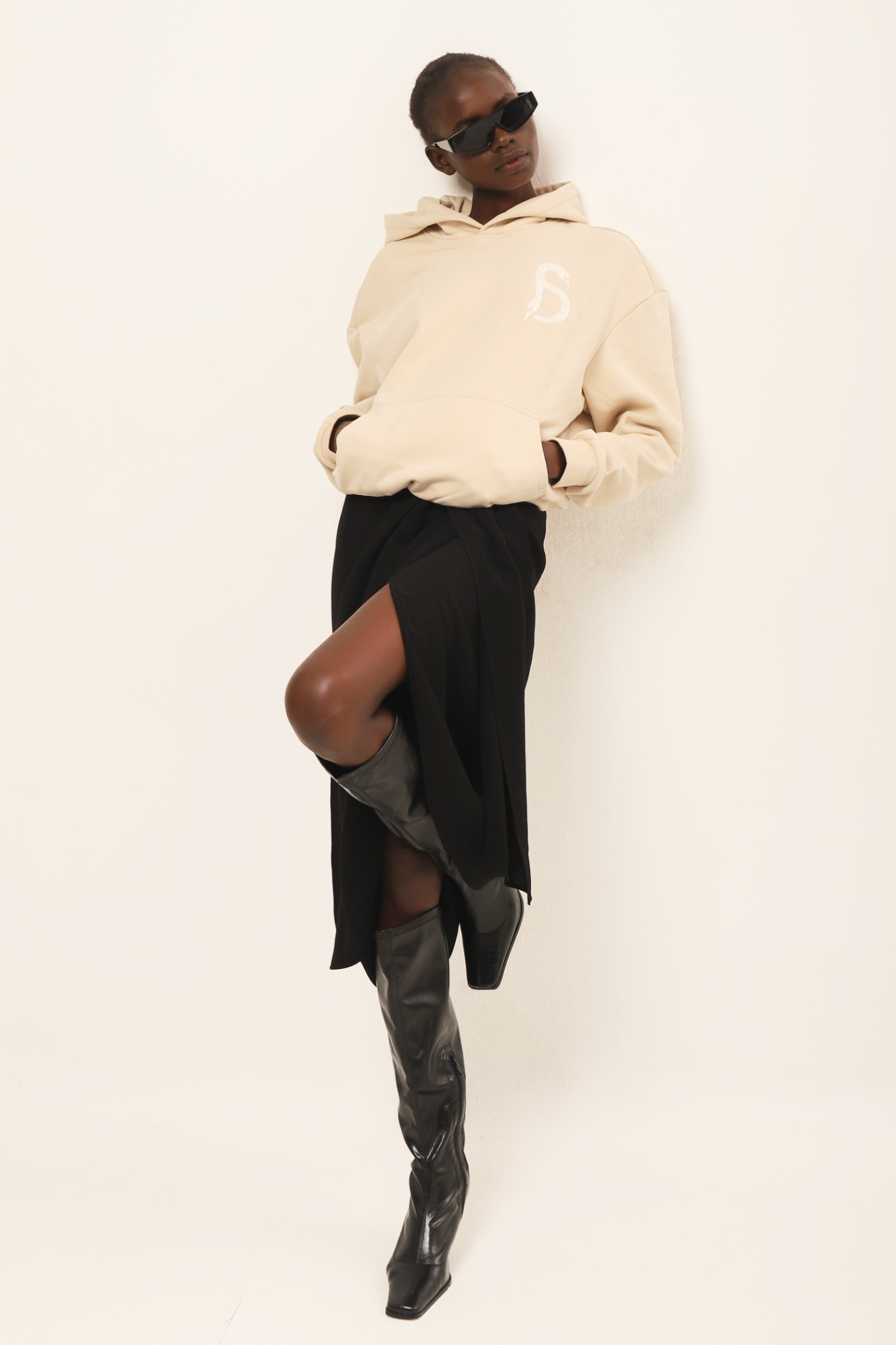 Falda cruzada con lazada al frente, cintura alta drapeada y largo midi. Hecha con nuestro exclusivo crepé de color negro.