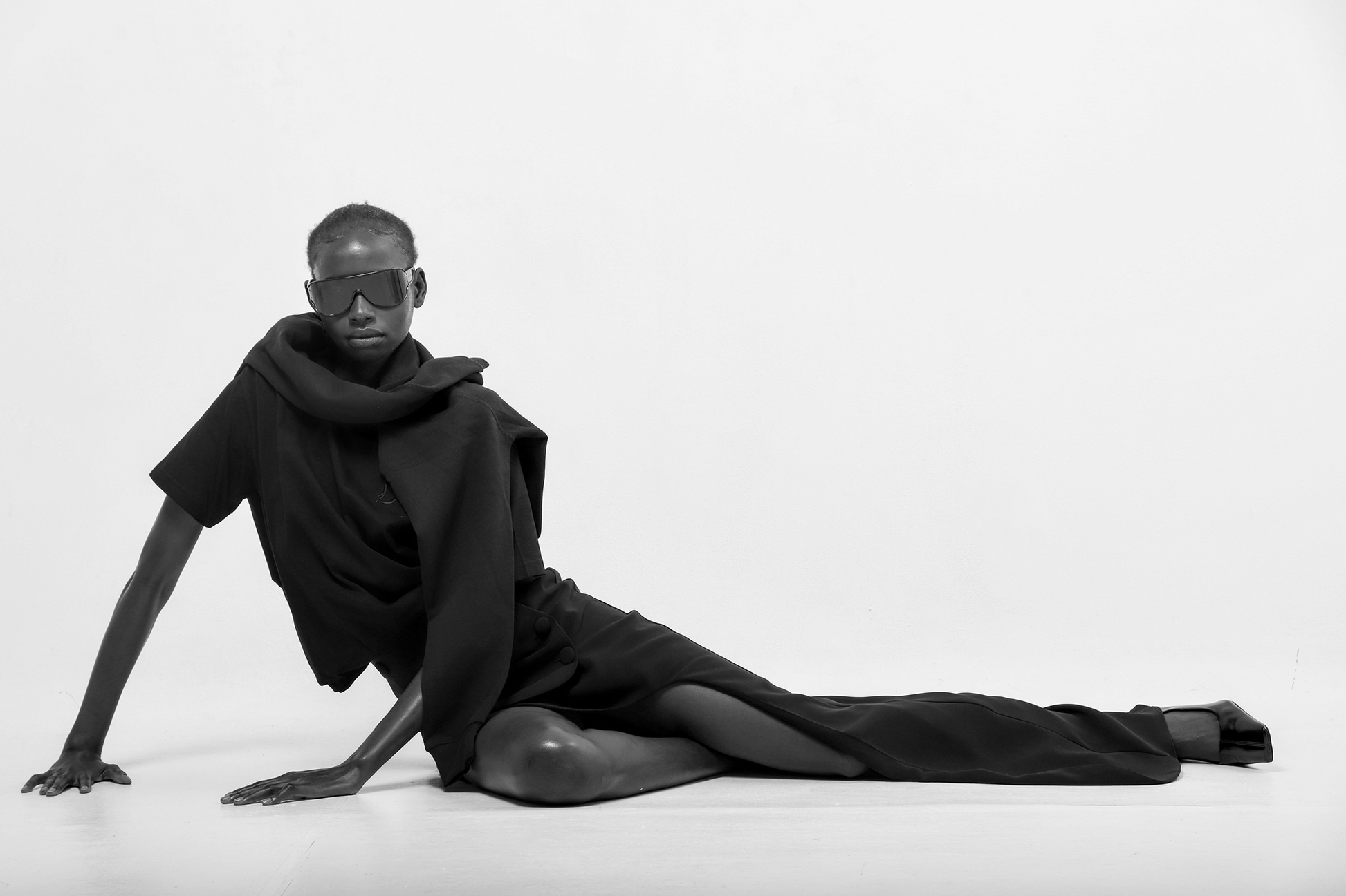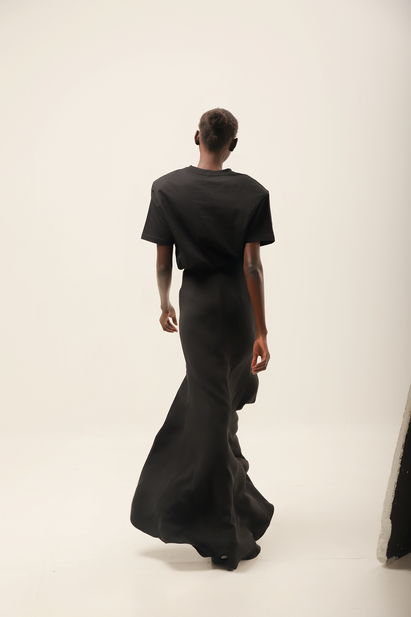 Falda cruzada, corta por delante y larga por detrás. Con botones forrados. Hecha con nuestro exclusivo crepé de color negro.