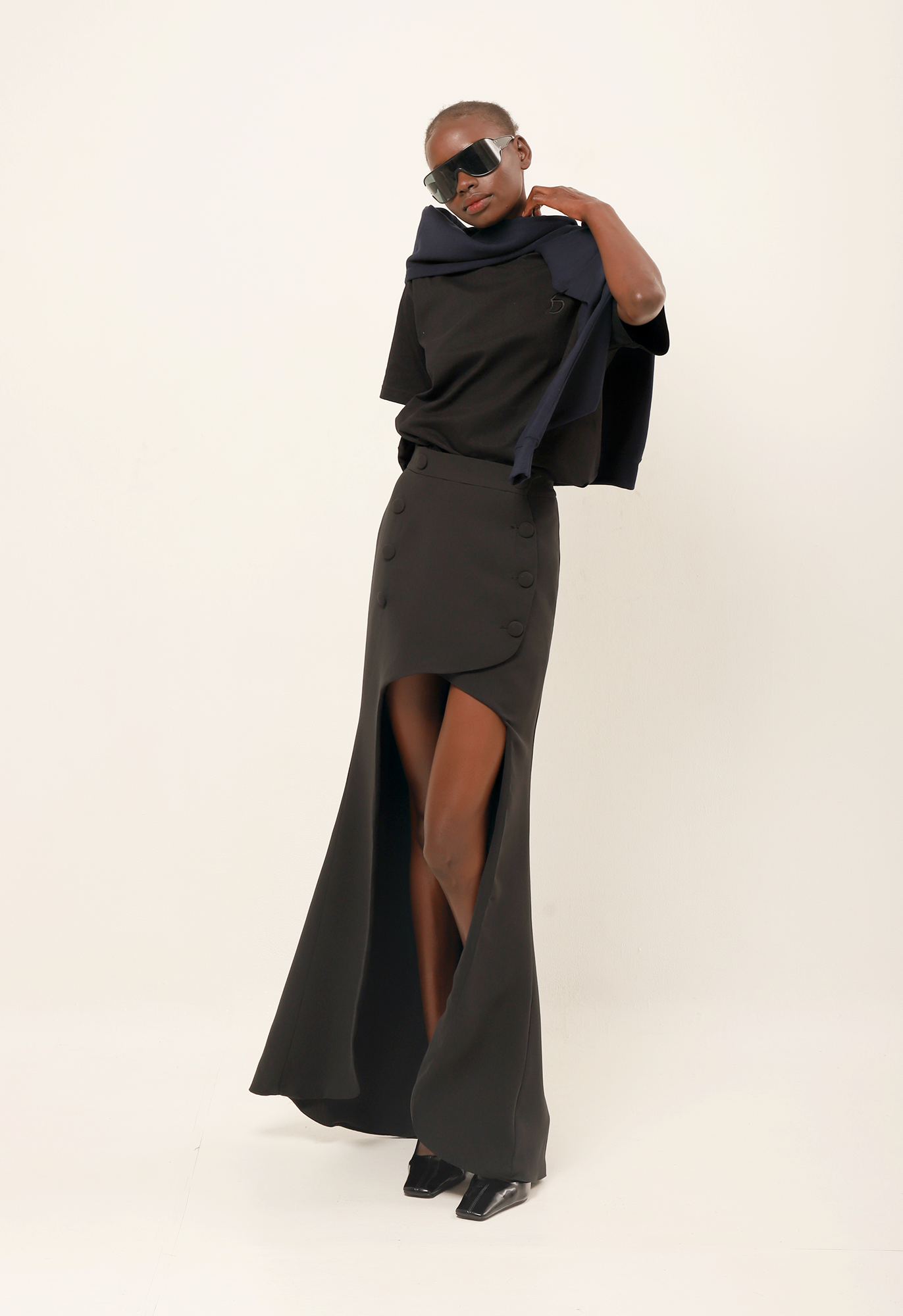 Falda cruzada, corta por delante y larga por detrás. Hecha en nuestro crepé de alta calidad en color negro. Con botones forrados.