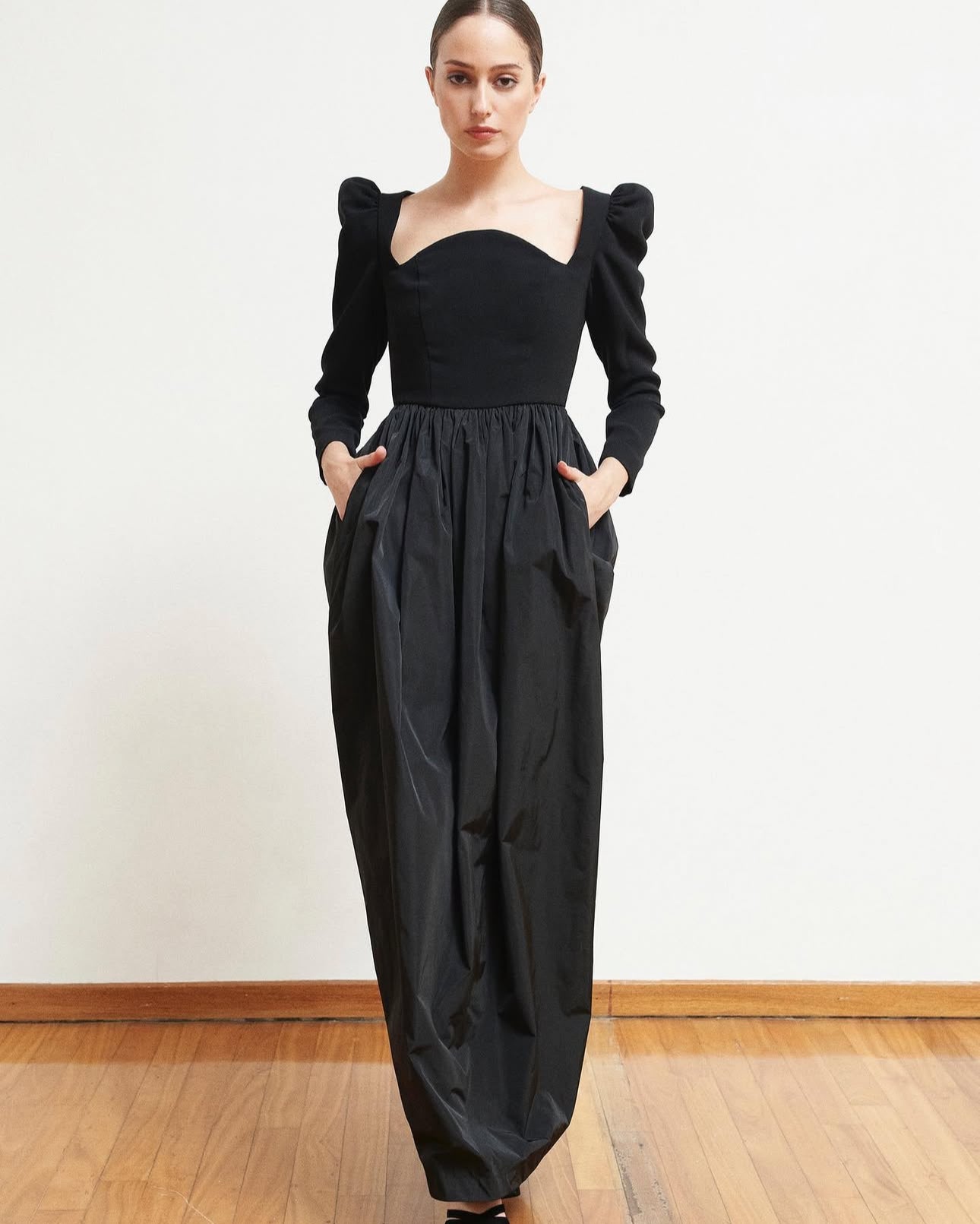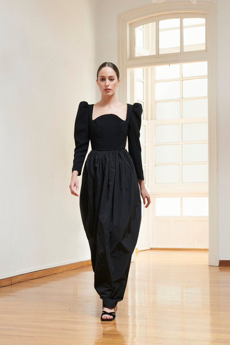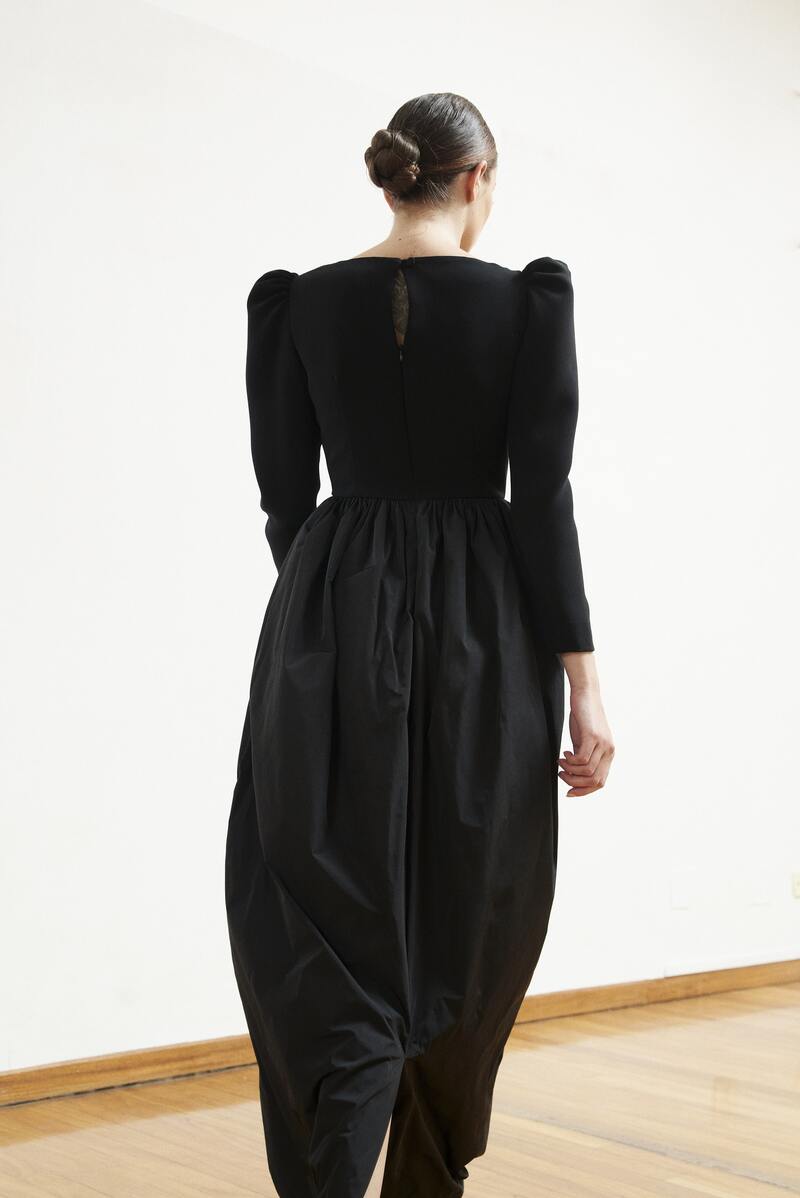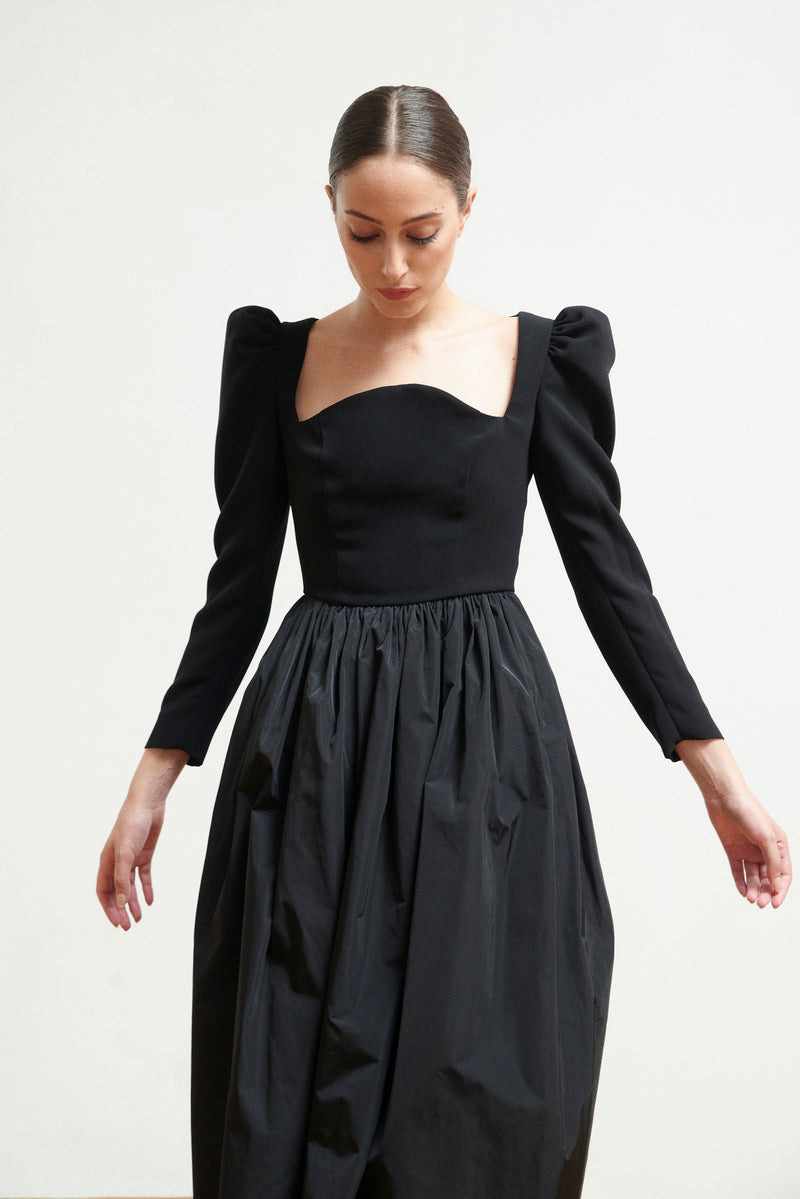 Vestido negro de crepe y falda de tafetán con bolsillos en color negro. Un fondo de armario para toda la vida.