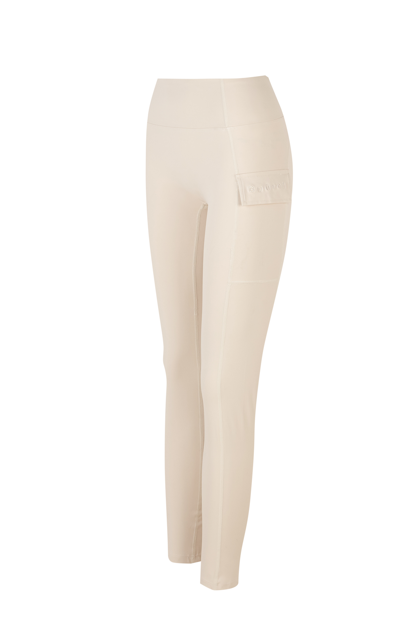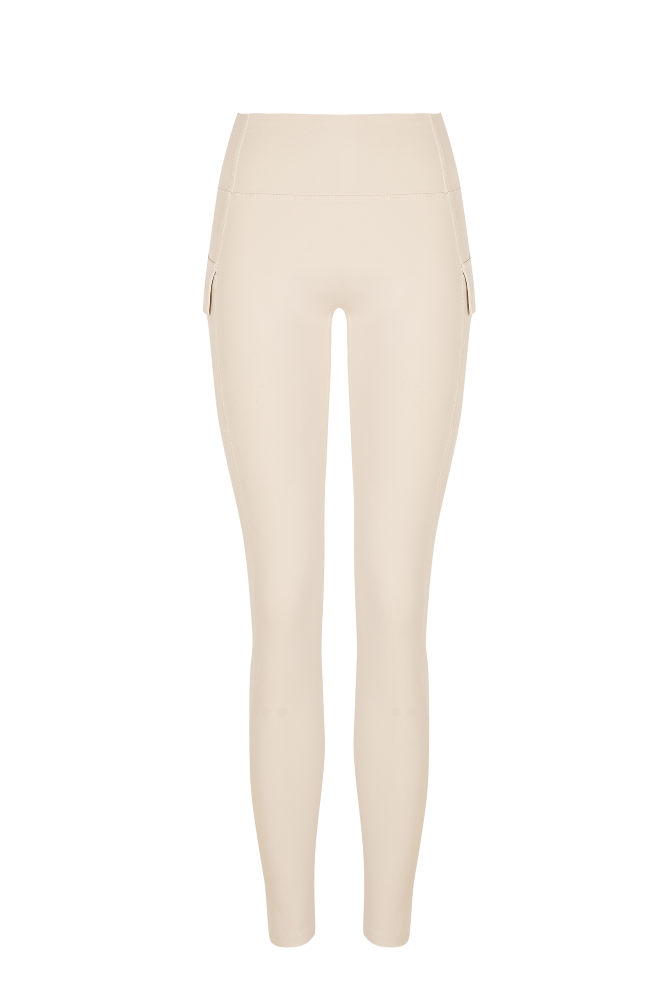 Leggings beige de cintura media y largo tobillero. Bolsillos laterales con solapa exterior y logo bordado al tono en uno de los bolsillos.