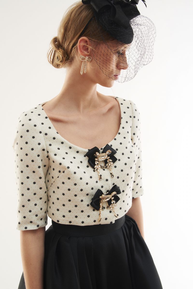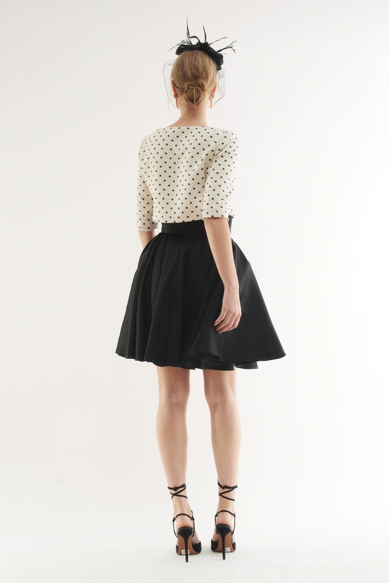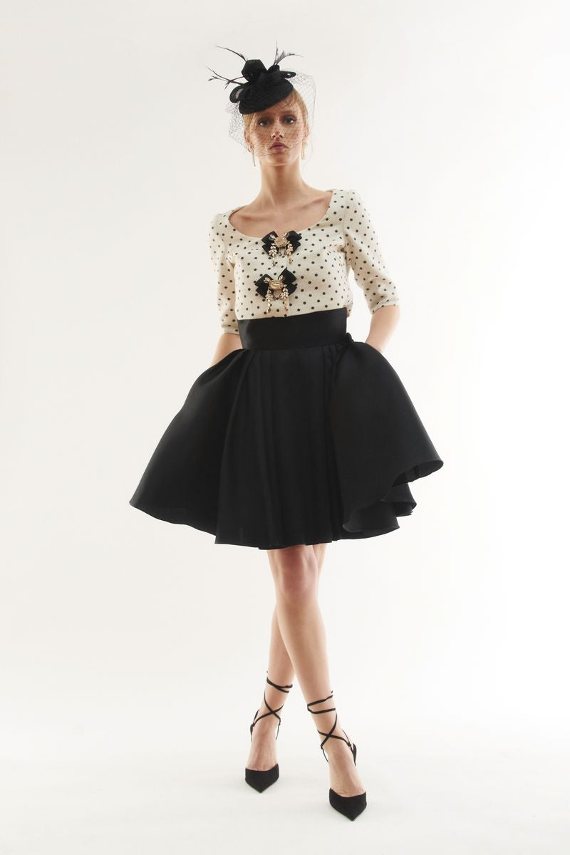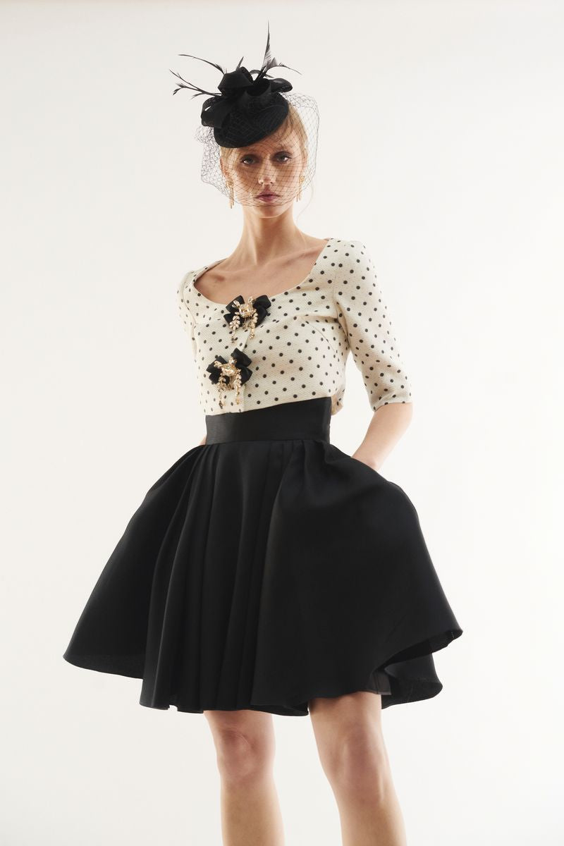 Bolero brocado de lunares beige y negro, con lazos en el cierre y falda con bolsillos en color negro de Tussord.