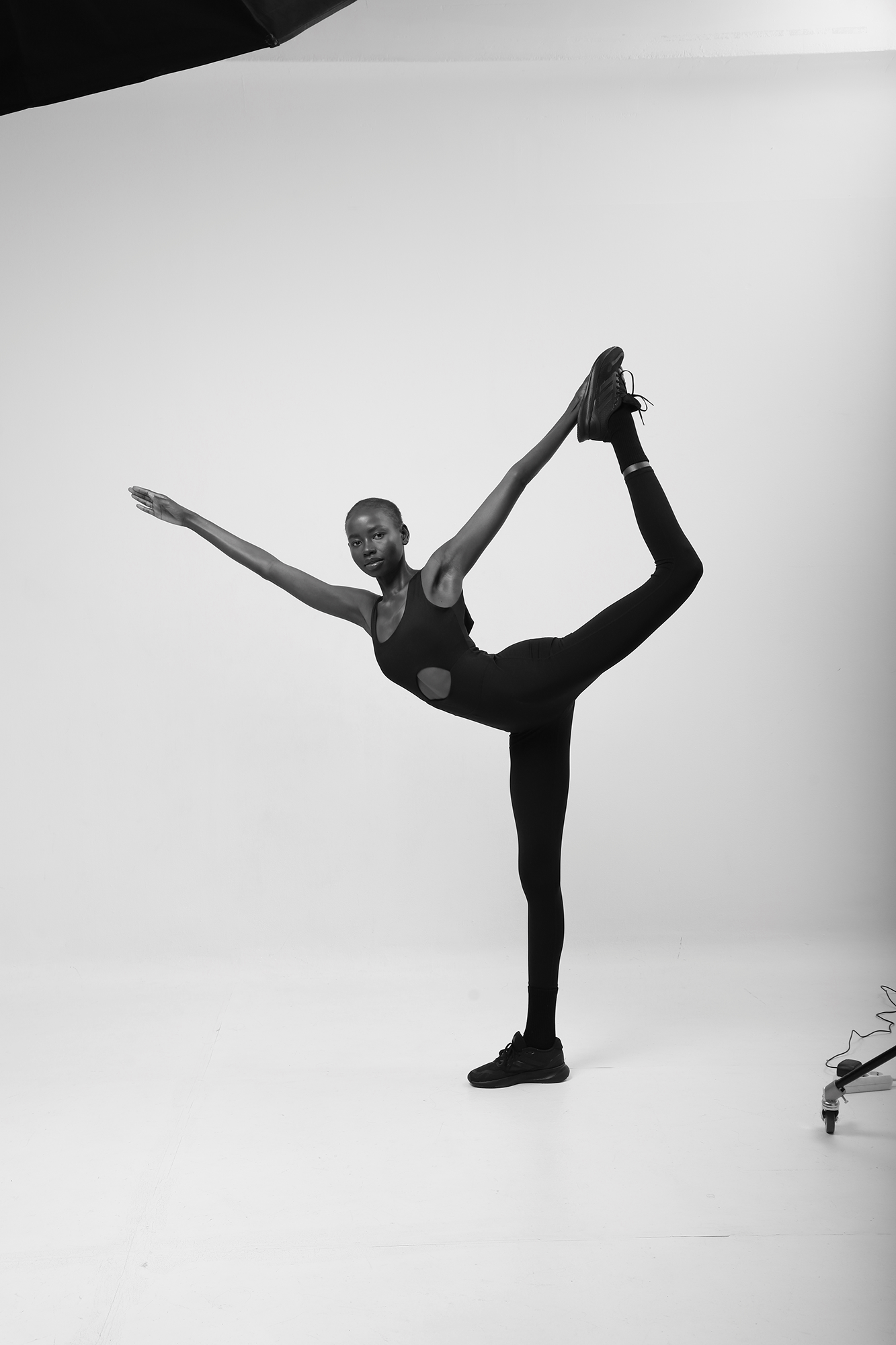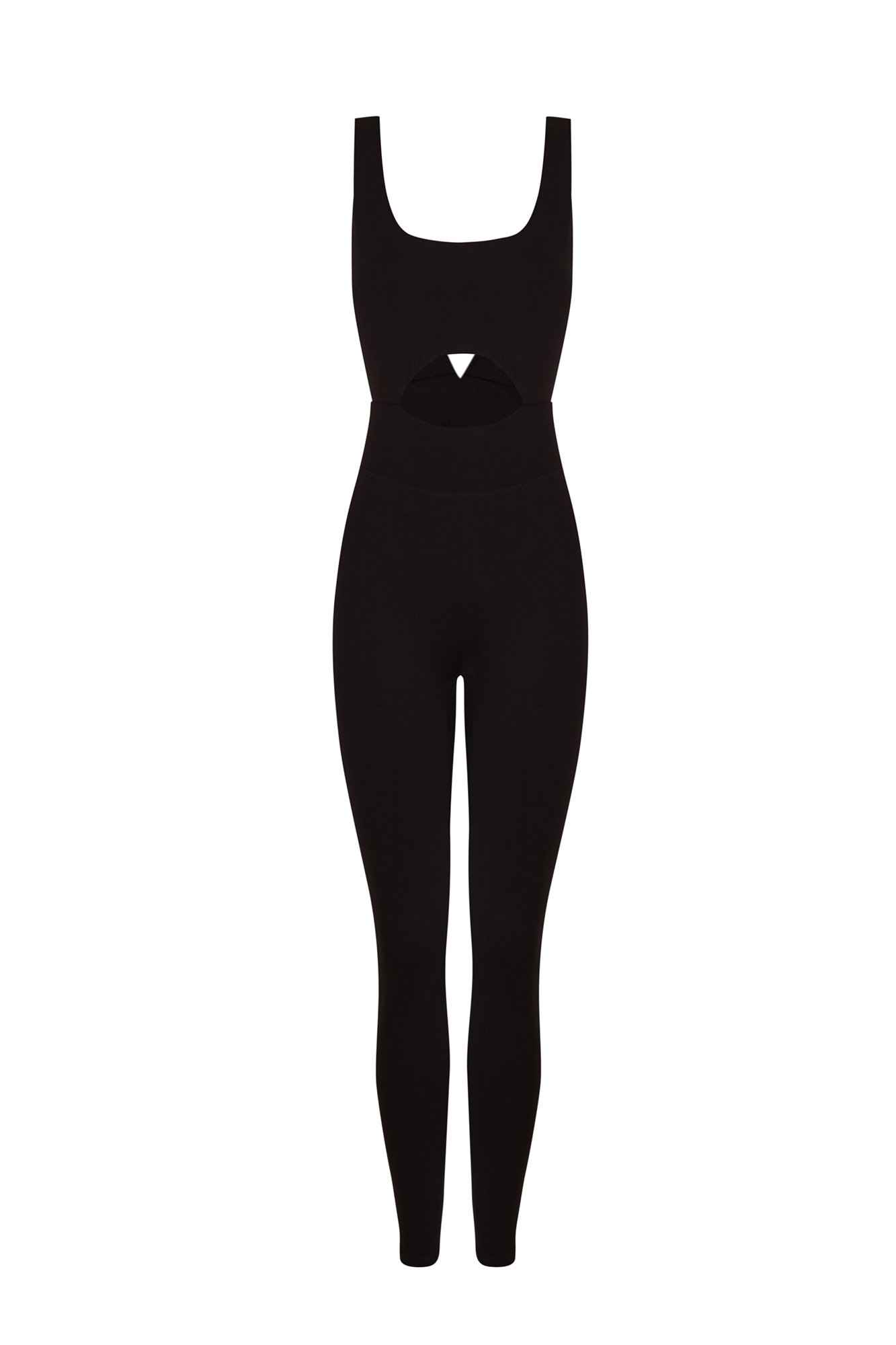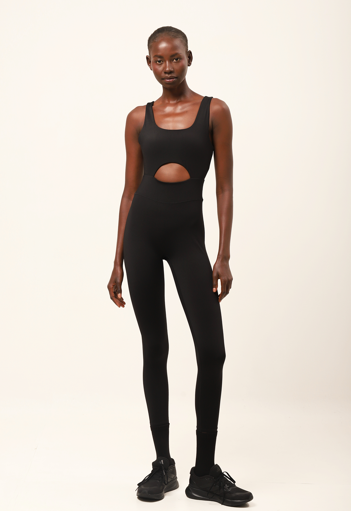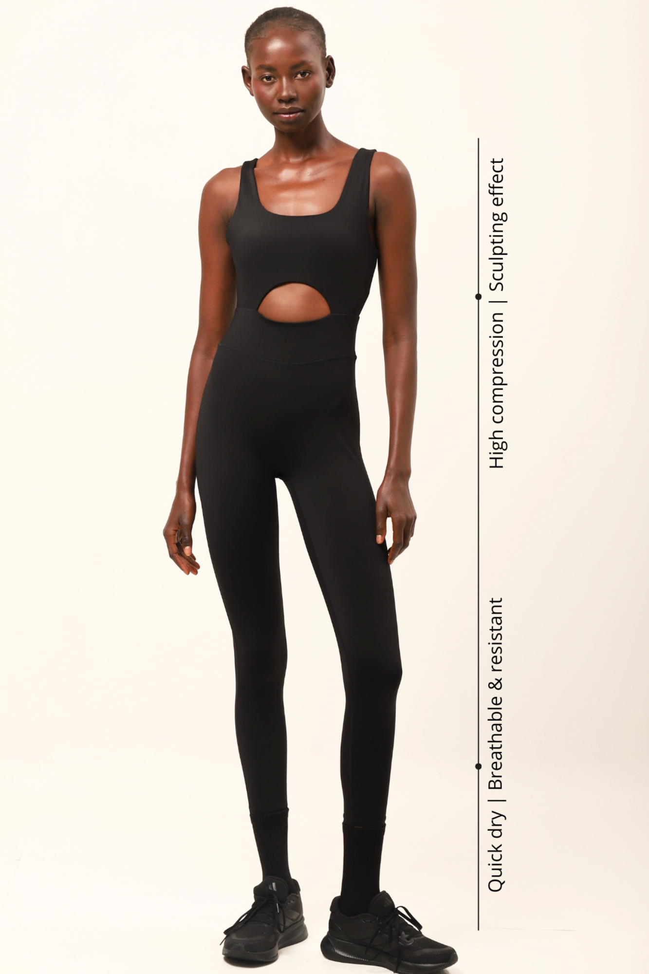 Mono deportivo negro con cutout en el frente y escote en V en la espalda. Logo bordado al tono en la espalda. Ajuste entallado y compresivo.