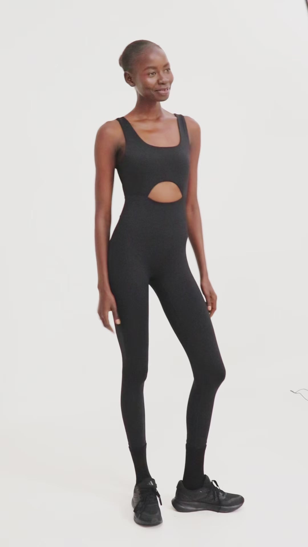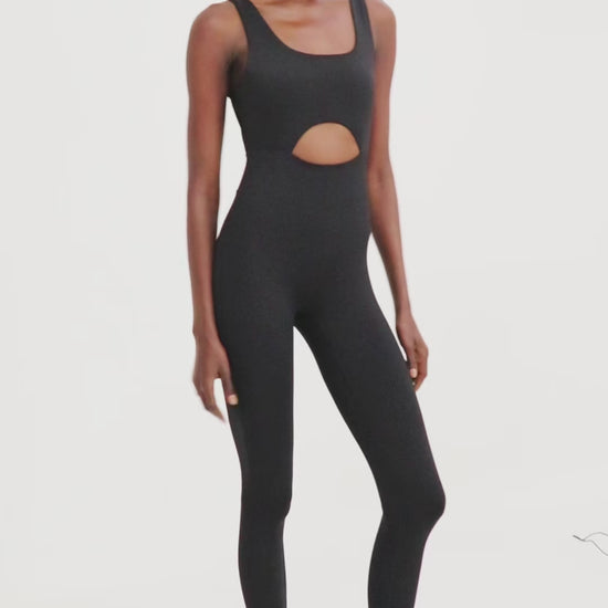 Mono deportivo negro con cutout en el frente y escote en V en la espalda. Tiene un logo bordado al tono en la parte posterior. Diseñado para un ajuste entallado y compresivo.