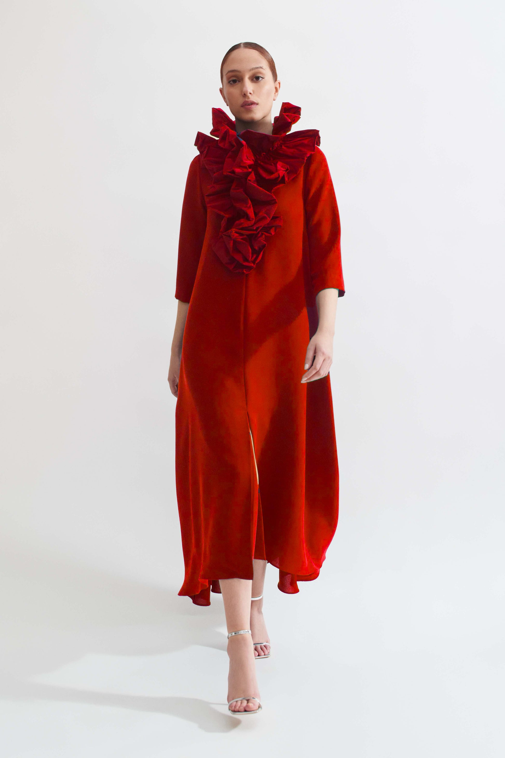 Vestido midi de corte capa con gorguera de tafetán roja, con largo justo por encima del tobillo. Su diseño en crepe de textura granulada, fluida y mate, transmite una elegancia silenciosa y atemporal.