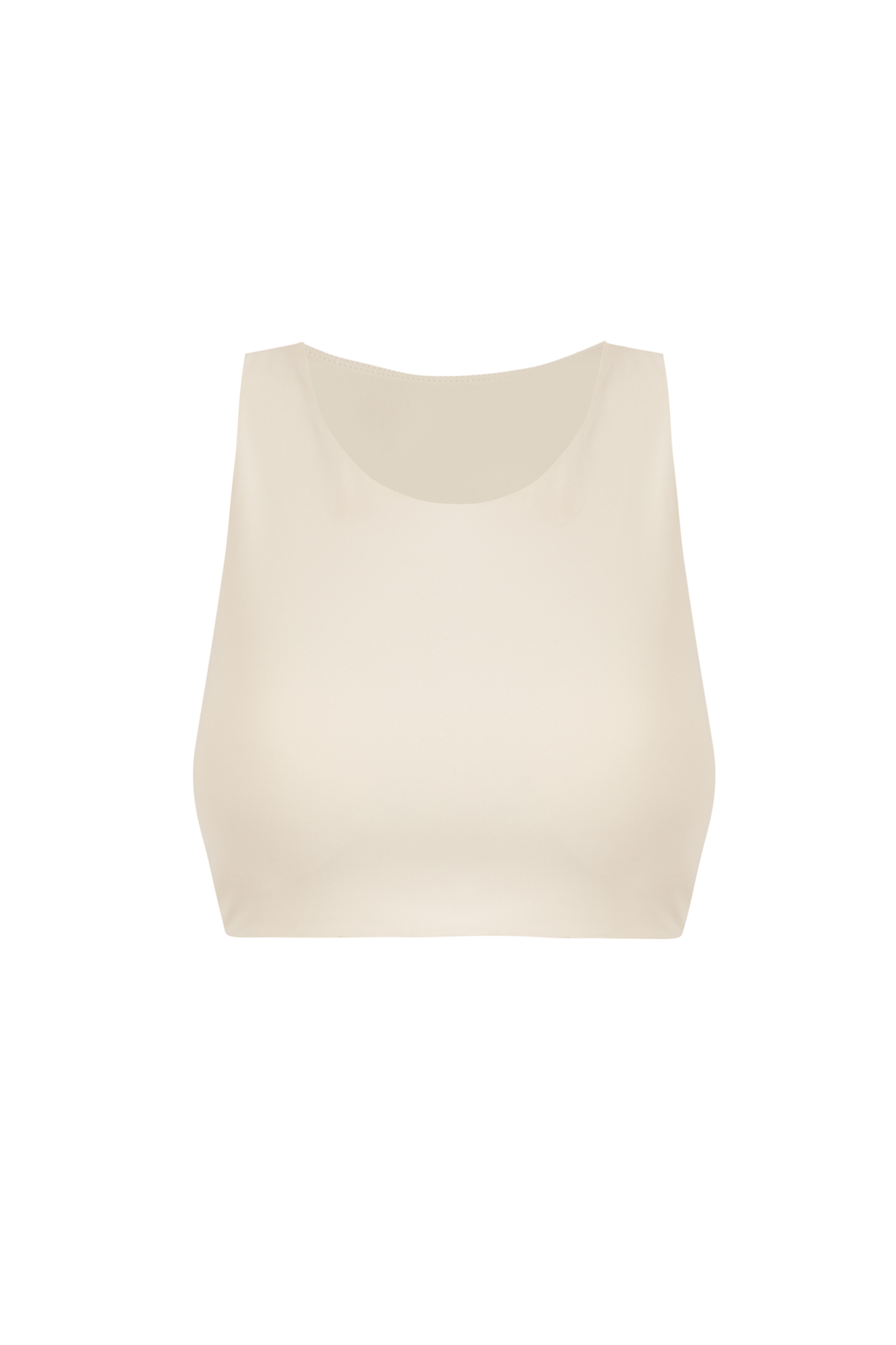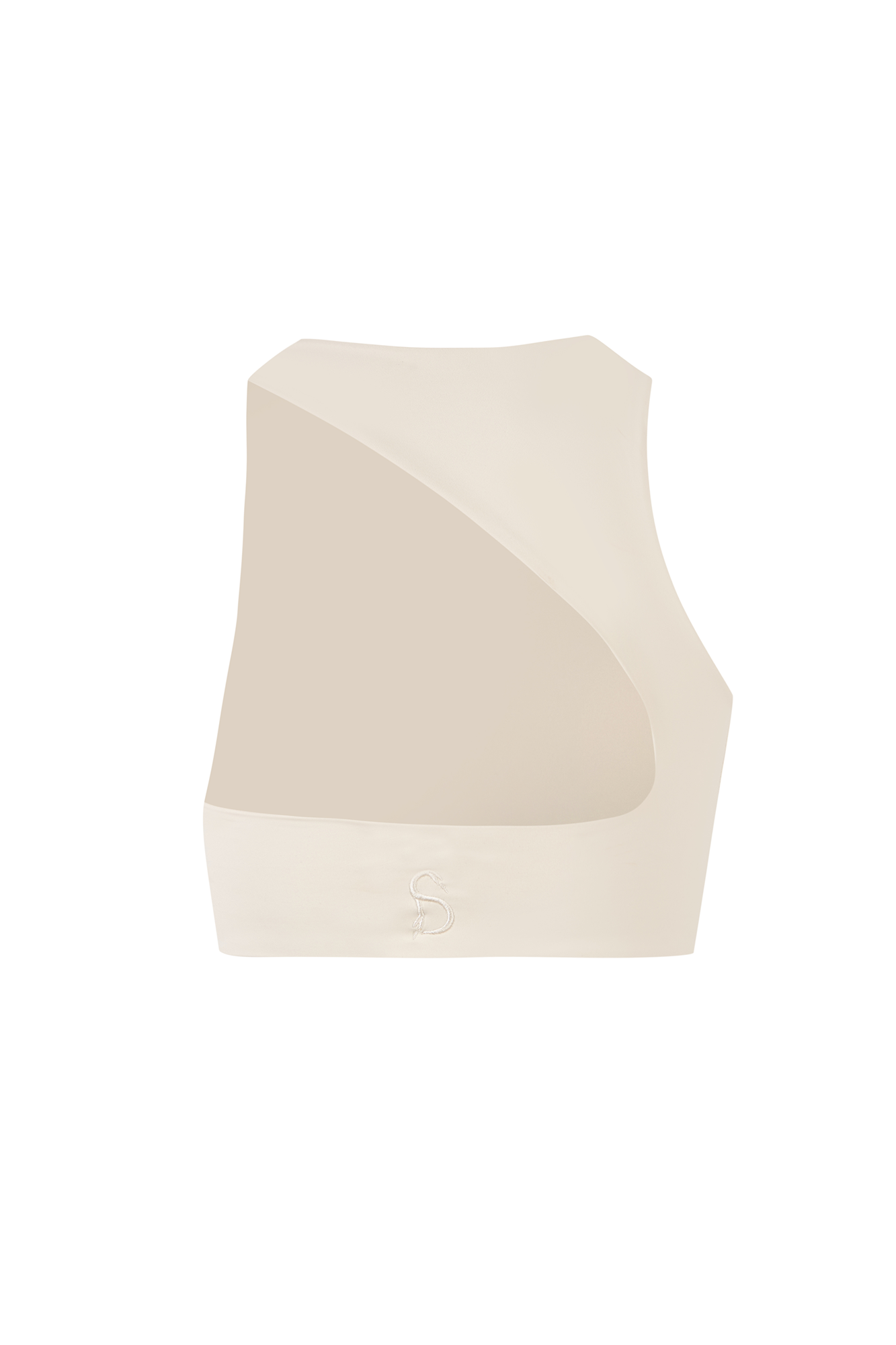 Top asimétrico beige con logo bordado al tono en la espalda. Lleva sujetador integrado para un mayor ajuste.