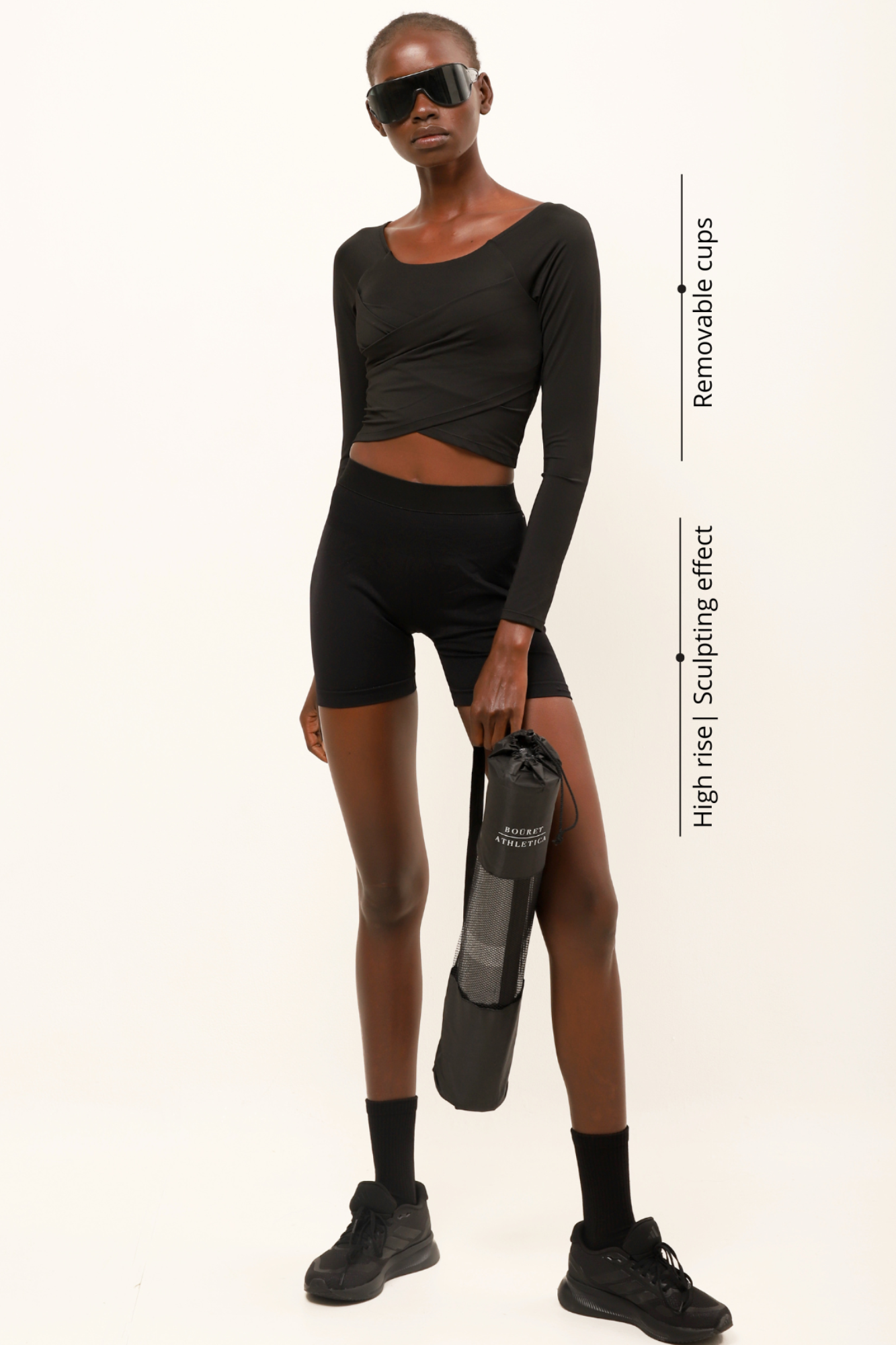 Top negro de manga larga con cruzado delantero y sujetador integrado. Logo bordado al tono en la espalda. Diseñado para un ajuste entallado y compresivo.