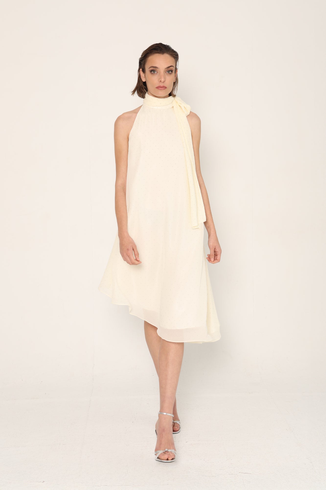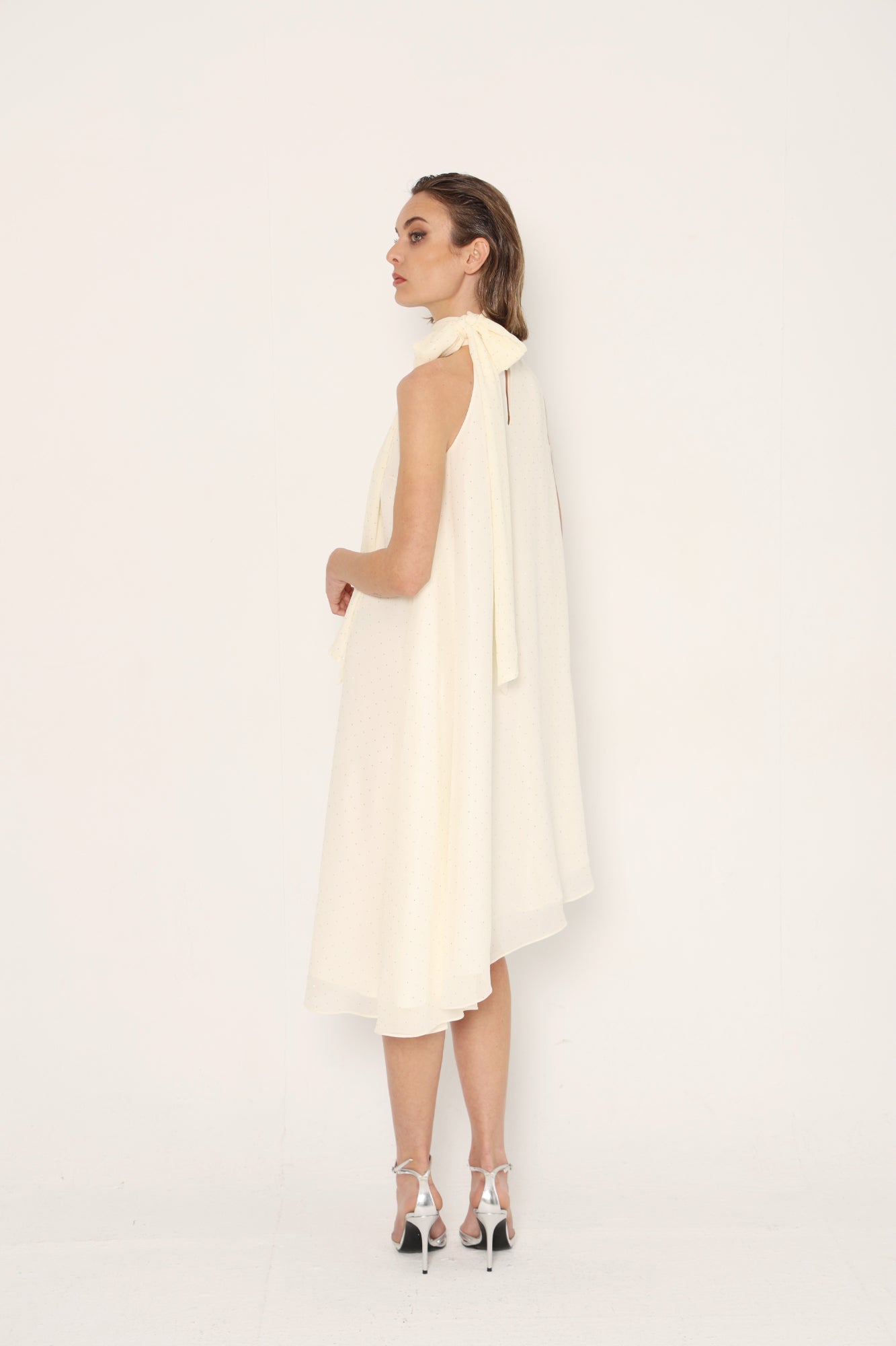Vestido Andrea midi de gasa beige con sutiles brillos en hilo dorado que capturan la luz con cada movimiento.