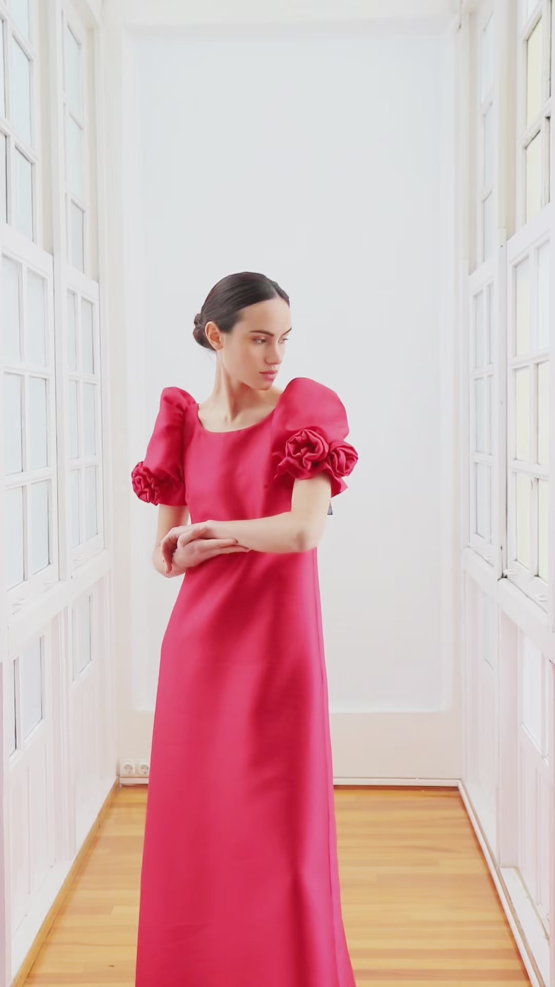 Las mangas abullonadas respiran drama; las flores hechas a mano,