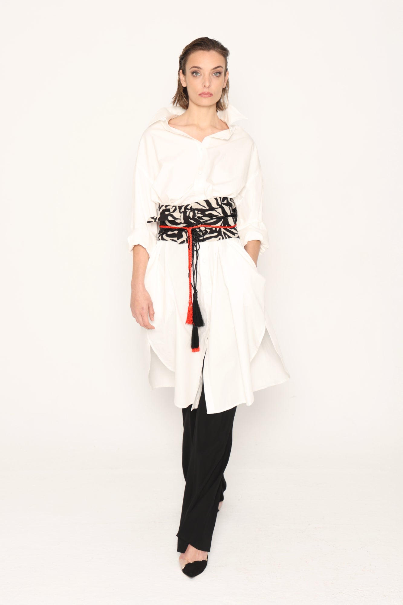 con iniciales o nombre. Se sujeta con un cinturón incorporado o con el fajín Khnor (no incluido). Tiene bolsillos y aberturas laterales.