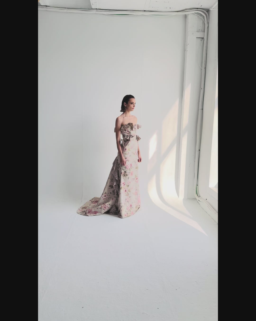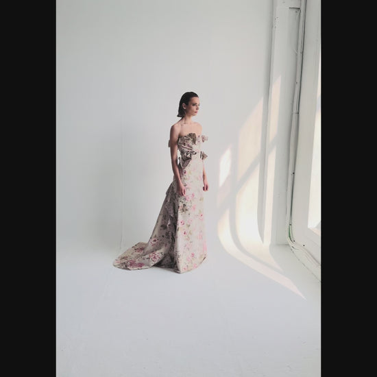 Vestido largo de gala confeccionado en gobelín floral de gran riqueza visual. Su tejido estructurado aporta cuerpo y presencia, realzando la silueta con una caída firme y elegante. El escote asimétrico con lazada sobre el hombro añade sofisticación contemporánea, mientras que la falda amplia genera volumen con carácter.