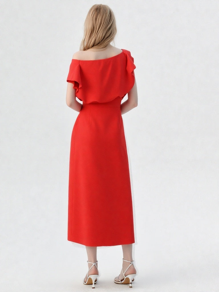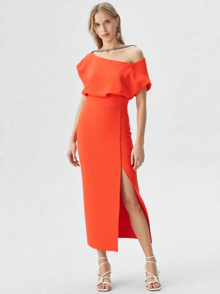 Vestido de crepe coral con cordón de strass.