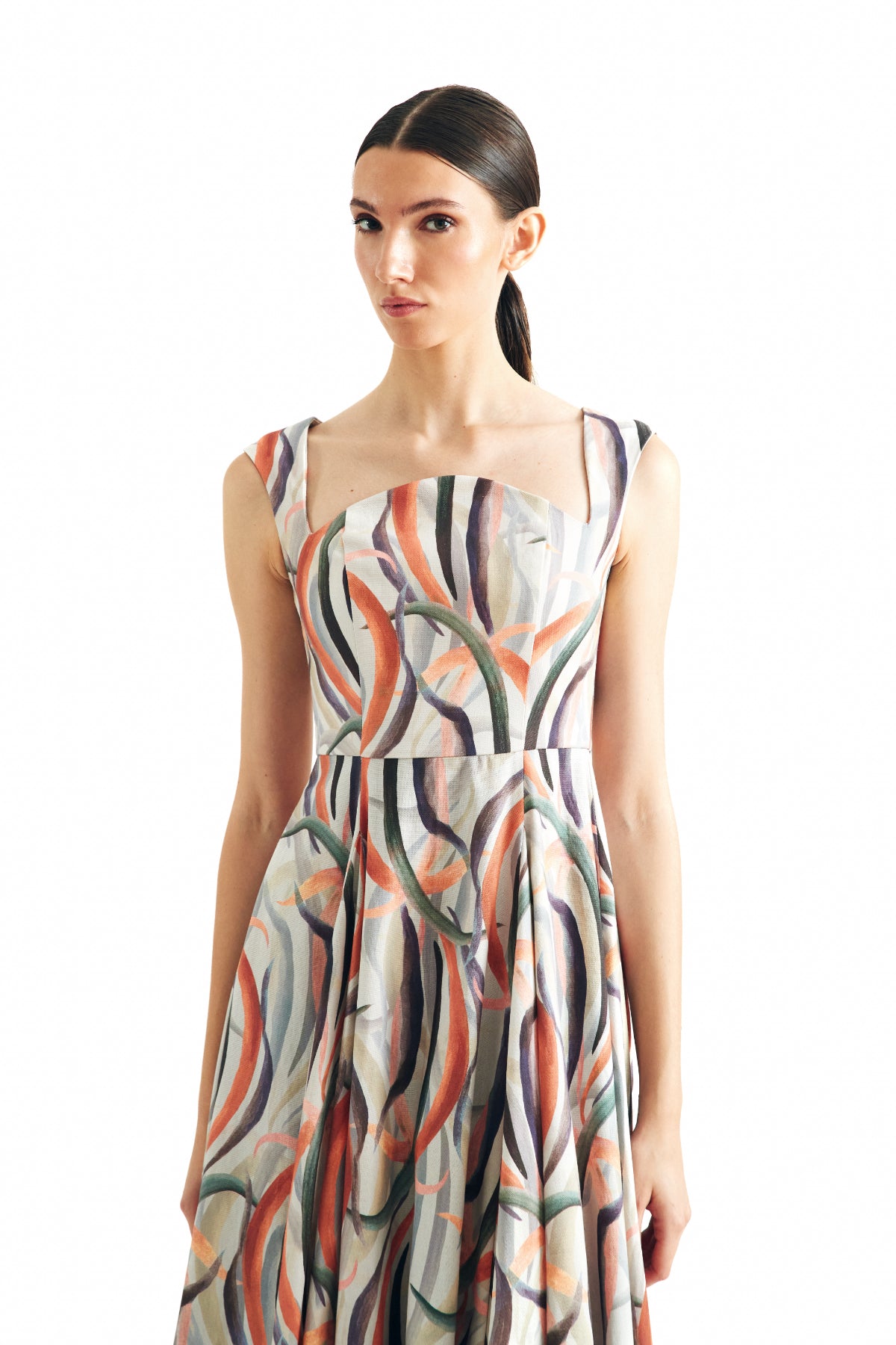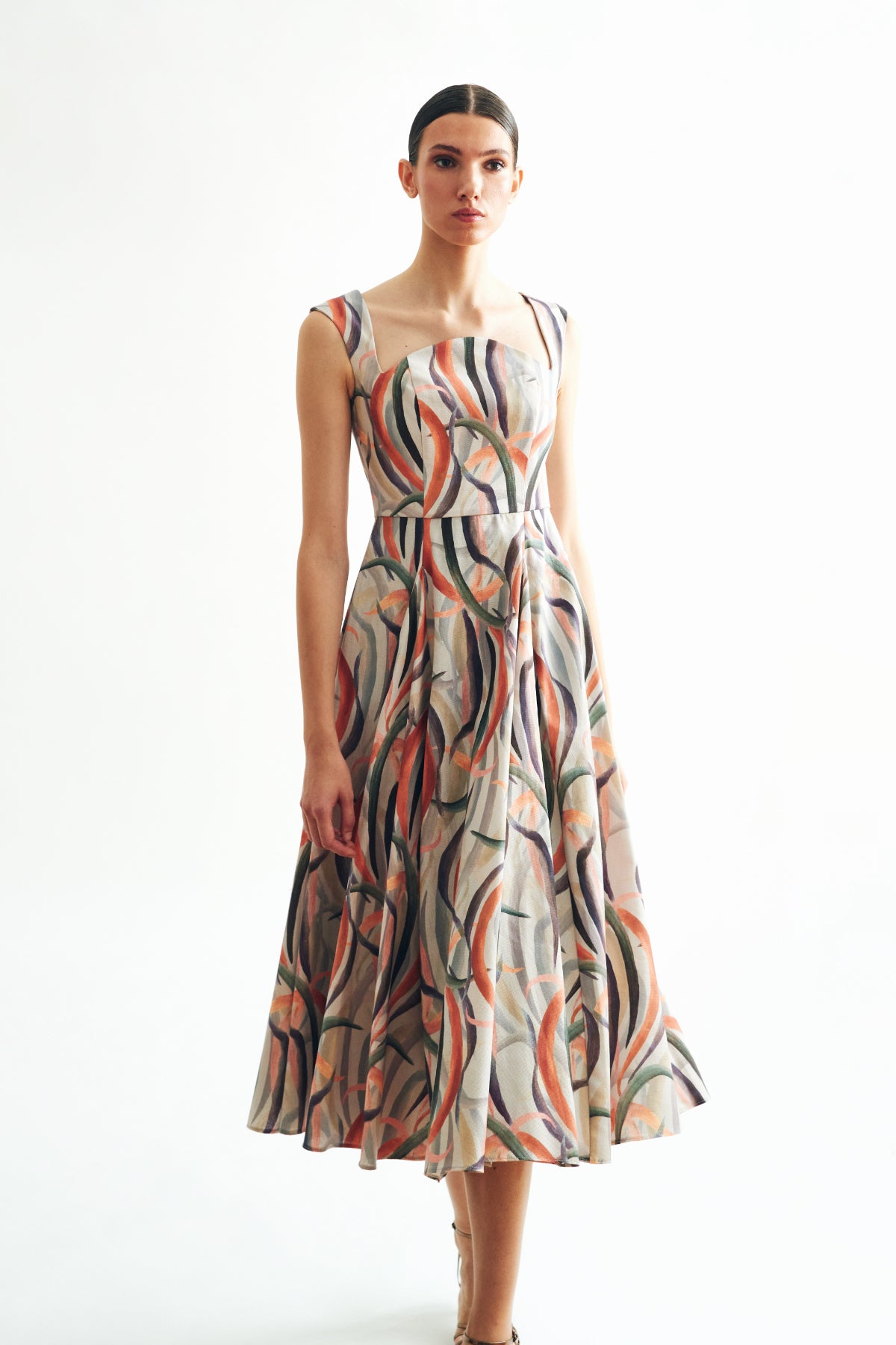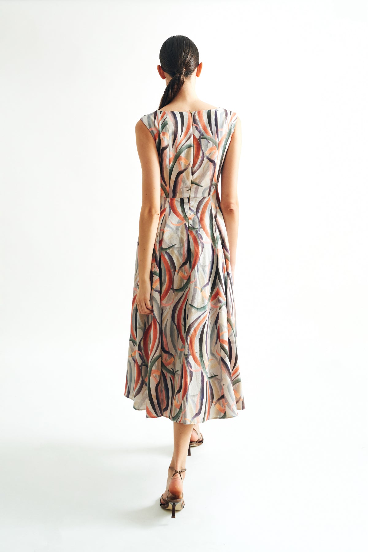 Vestido midi de Edición Limitada confeccionado en panamá de algodón con un estampado artístico en tonos suaves y vibrantes. Su escote semicircular enmarca el busto con delicadeza, mientras que la falda de vuelo con bolsillos aporta movimiento, comodidad y un aire atemporal.