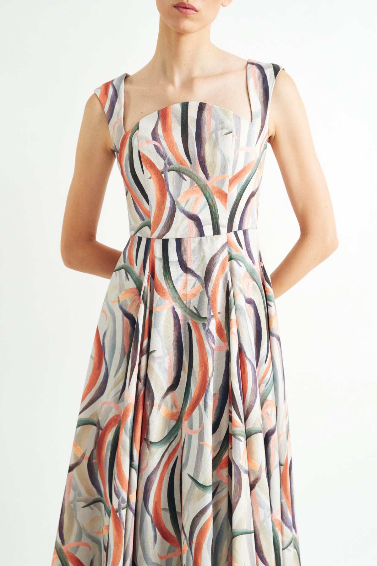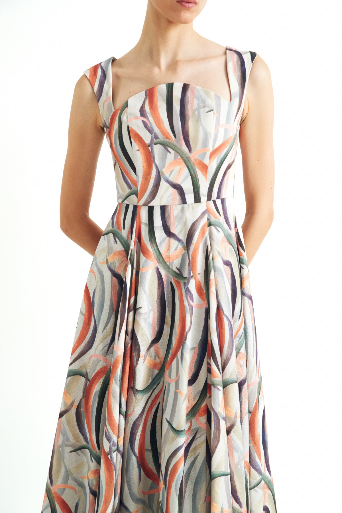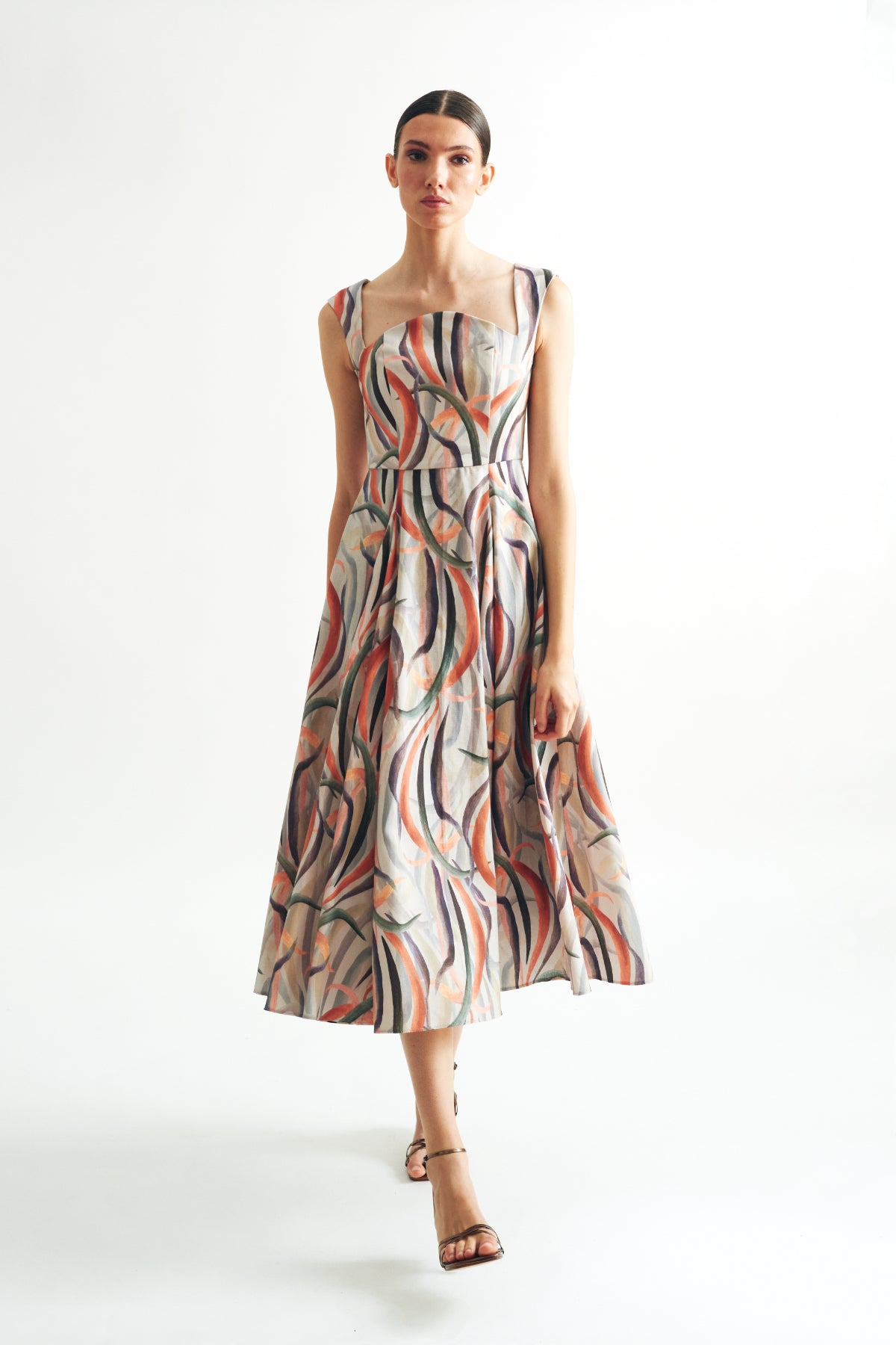 Vestido midi de Edición Limitada confeccionado en panamá de algodón con un estampado artístico en tonos suaves y vibrantes. Su escote semicircular enmarca el busto con delicadeza, mientras que la falda de vuelo con bolsillos aporta movimiento, comodidad y un aire atemporal.