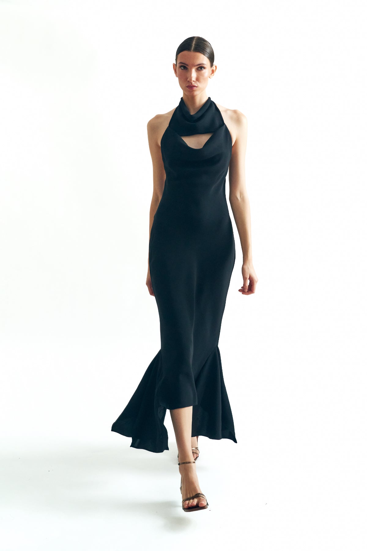 Clásico LBD (little black dress) en crepé negro, con un diseño elegante y favorecedor. Presenta un escote drapeado en el delantero que estiliza el cuello y el pecho con sutileza, y una espalda al descubierto que aporta un toque sofisticado y sensual. Su silueta entallada realza la figura y el bajo asimétrico añade movimiento y carácter al caminar.